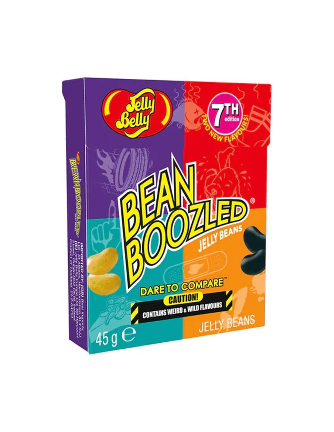 Jelly Belly Bean Boozled es el juego de dulces más loco de EE. UU. Esta caja de 45 g contiene 20 sabores: 10 deliciosos y 10 absolutamente repugnantes, pero visualmente idénticos . ¿Melocotón o vómito? ¿Pera jugosa o moco? ¿Tutti-Frutti o calcetines sucios? No lo sabrás hasta que pruebes un bocado. El desafío definitivo para tus fiestas y reuniones con amigos.
