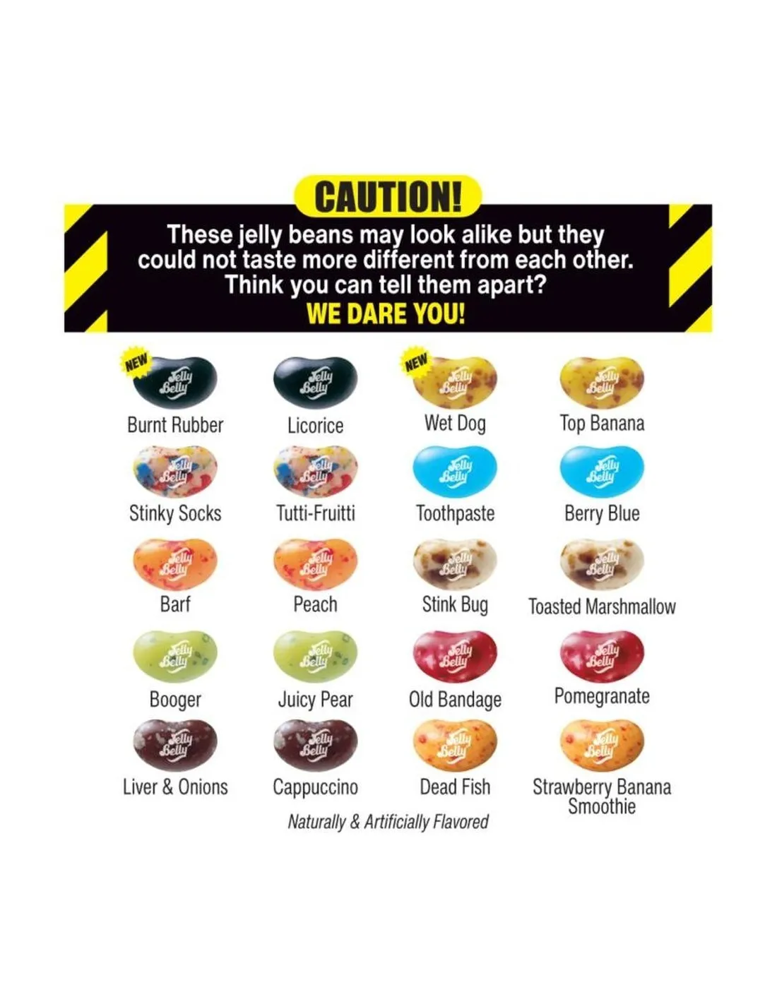 Los duelos de sabores en esta edición: Azul Baya o Pasta de Dientes , Pera Jugosa o Moco , Melocotón o Vómito , Tutti-Frutti o Calcetines Sucios , Smoothie de Fresa y Plátano o Pescado Muerto , Malvavisco Tostado o Chinche , Granada o Vendaje Viejo , Capuchino o Hígado con Cebolla , Plátano o Perro Mojado , Regaliz o Goma Quemada . La intensidad de los sabores repulsivos es asombrosamente realista: el secreto del proceso de fabricación de Jelly Belly, que impregna el sabor directamente en el corazón del dulce.