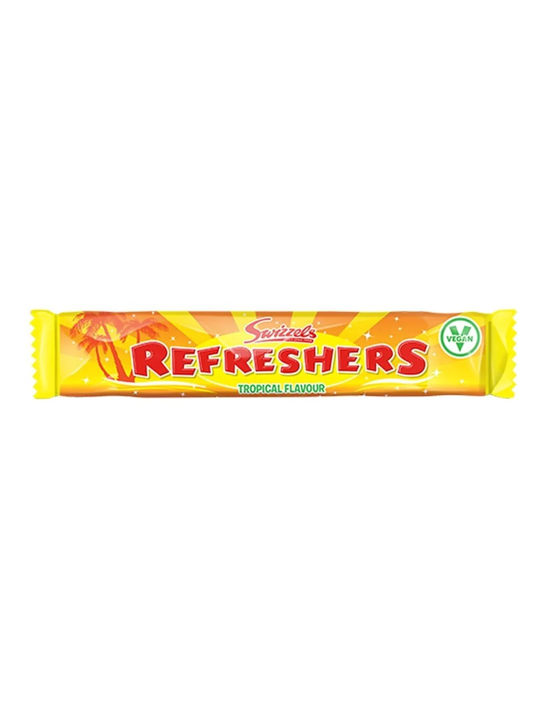 Swizzels Refreshers Tropical es una barrita masticable repleta de exóticos sabores a mango y piña , con un centro de sorbete burbujeante que cruje en la boca. Una versión tropical de los icónicos Refreshers británicos, inventados hace más de 70 años. Vegano , sin gluten , apto para celíacos y halal . Sin colorantes artificiales. Barrita individual de 18 g .