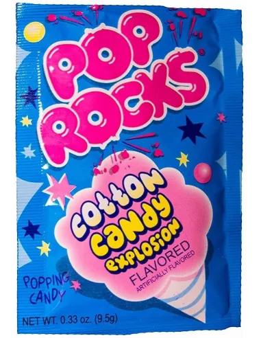 Pop Rocks Cotton Candy (edición limitada) son pequeños caramelos en forma de mini cristales con sabor a algodón de azúcar que explotan en cuanto te los pones en la boca. Explota, chisporrotea, el sabor estalla de repente en tu boca por un momento de placer que te transportará a tu infancia para los mayores.