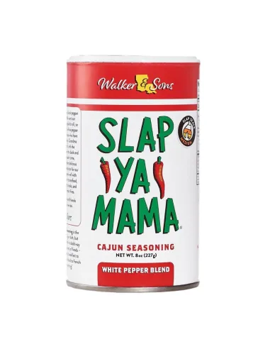 La mezcla de pimienta blanca y condimento cajún Slap Ya Mama ofrece una versión más sutil y sofisticada del condimento cajún tradicional. Esta versión reemplaza la pimienta negra por pimienta blanca , aportando un toque más suave y terroso, a la vez que conserva los ingredientes básicos de la receta de la familia Walker: sal , pimienta de cayena , ajo y especias cajún secretas.