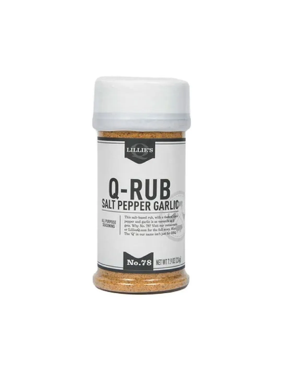 El condimento Q Q-Rub Sal, Pimienta y Ajo de Lillie es un condimento para barbacoa estadounidense creado por un bicampeón mundial de barbacoa . Este versátil condimento, elaborado con sal marina , pimienta negra y ajo, realza todas tus carnes con la simplicidad y eficacia de los mejores maestros de la parrilla.