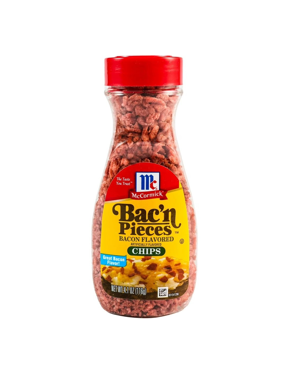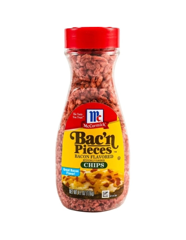 ¿Te encanta el tocino? ¡Te encantará el formato "Chips"! Los chips McCormick Bac'n Pieces ofrecen trozos más grandes que los clásicos "Bits" para una experiencia sensorial mejorada. La marca McCormick creó estos nuggets para quienes buscan un toque crujiente y delicioso. Cada rebanada desprende un sabor ahumado a nogal americano y un toque salado que recuerda al auténtico tocino asado del desayuno.
