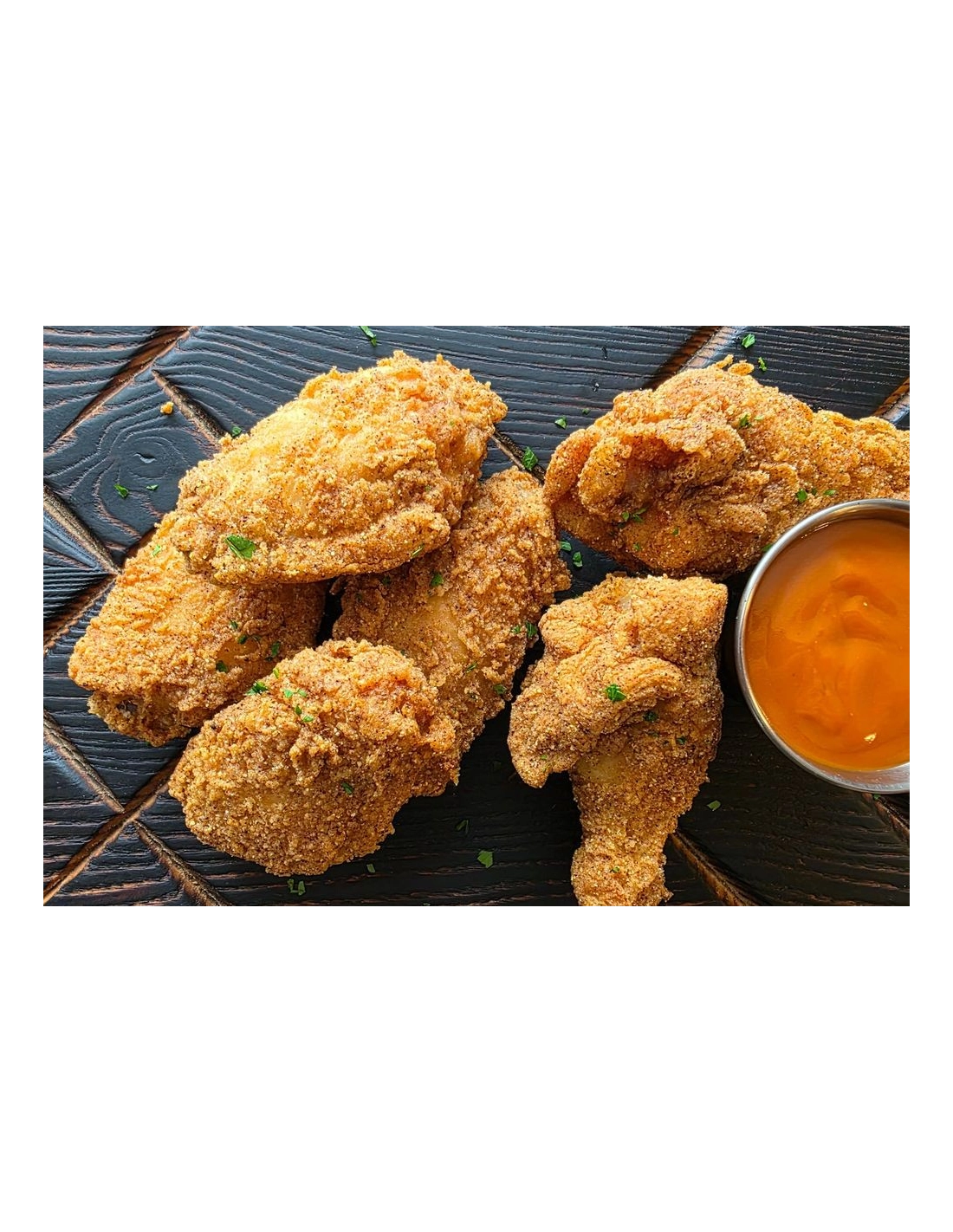 Pescado frito al estilo Louisiana, alitas de pollo fritas picantes
