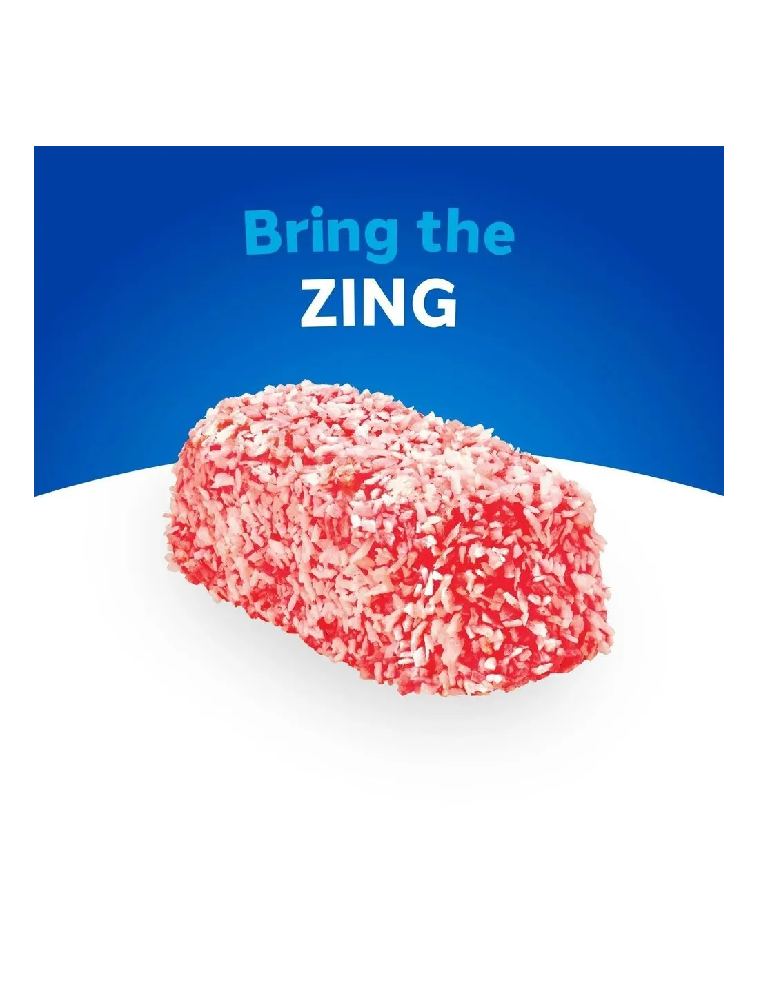 Los Zingers Raspberry d'Hostess American cakes son unas pequeñas galletas ligeras y blandas, rellenas de crema Hostess y cubiertas con un bizcocho de frambuesa . Cada frambuesa Zingers también está cubierta con virutas de coco.