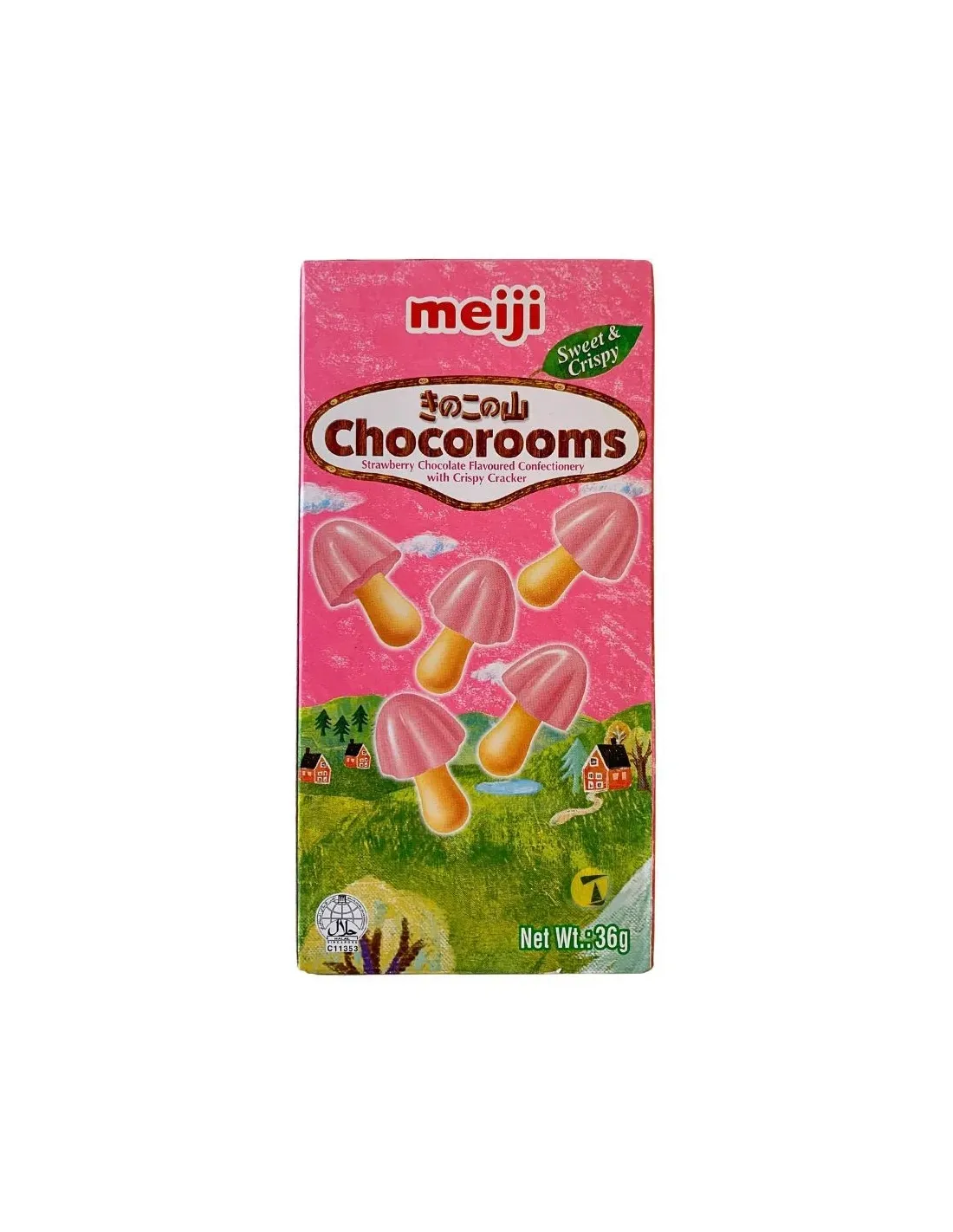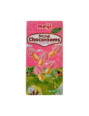 Las galletas Meiji Chocorooms de fresa son pequeñas galletas japonesas con forma de seta , que consisten en un palito de galleta crujiente y un sombrero de chocolate con fresa .