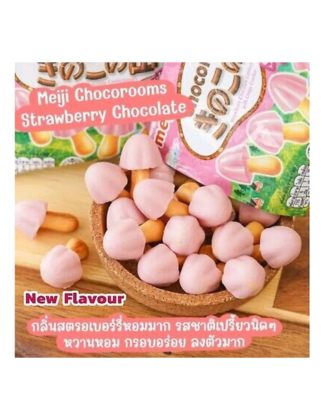Los Meiji Chocorooms de fresa son una de las creaciones más kawaii de la famosa marca japonesa Meiji , conocida por sus snacks gourmet y divertidos.