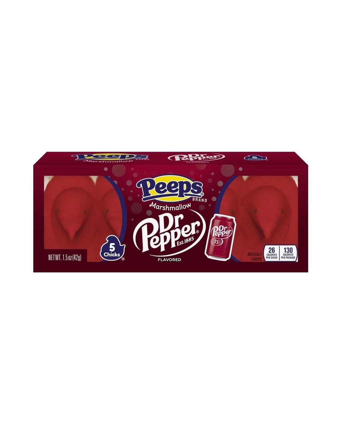 Esta práctica caja que contiene 5 adorables pollitos de malvavisco ofrece la textura ligera y que se deshace en la boca que hace tan populares a los Peeps, recubiertos con una fina capa de azúcar crujiente de un hermoso color rojo intenso. Pero la verdadera magia ocurre al probarlos: ¡desde el primer bocado, una explosión de sabores típicos del refresco Dr Pepper (sutiles notas de cereza, amaretto, vainilla y caramelo) inunda tu paladar!