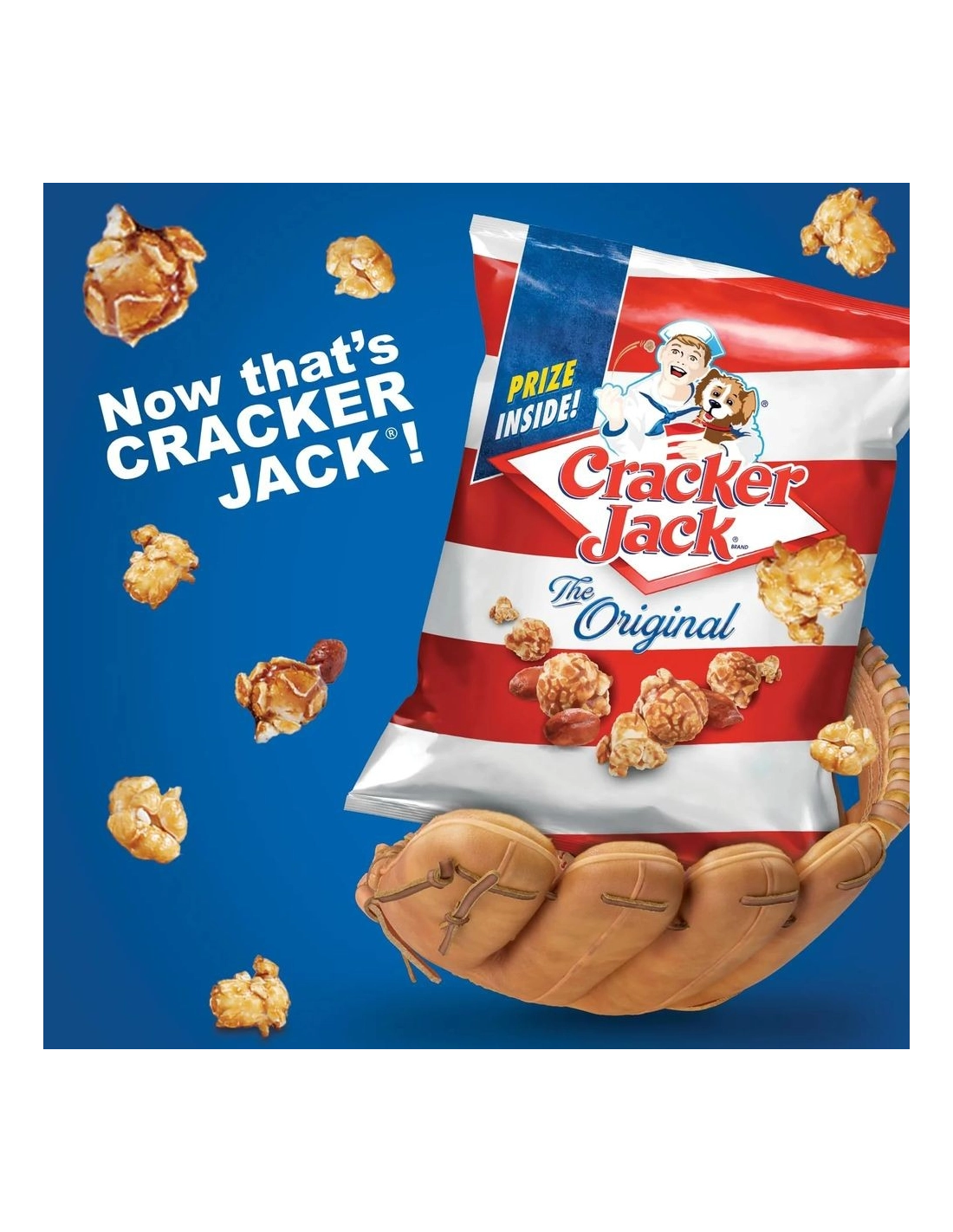 Cracker Jack The Original ha sido el refrigerio estadounidense legendario desde 1893. Esta irresistible mezcla de palomitas de maíz cubiertas de melaza y cacahuetes crujientes es un pilar de la cultura estadounidense, inmortalizada en la canción " Llévame al Juego de Pelota ". ¡Cada caja contiene una sorpresa ! Receta sencilla: azúcar, jarabe de maíz, palomitas de maíz, cacahuetes, melaza y sal. Hecho en EE. UU. por Frito-Lay .