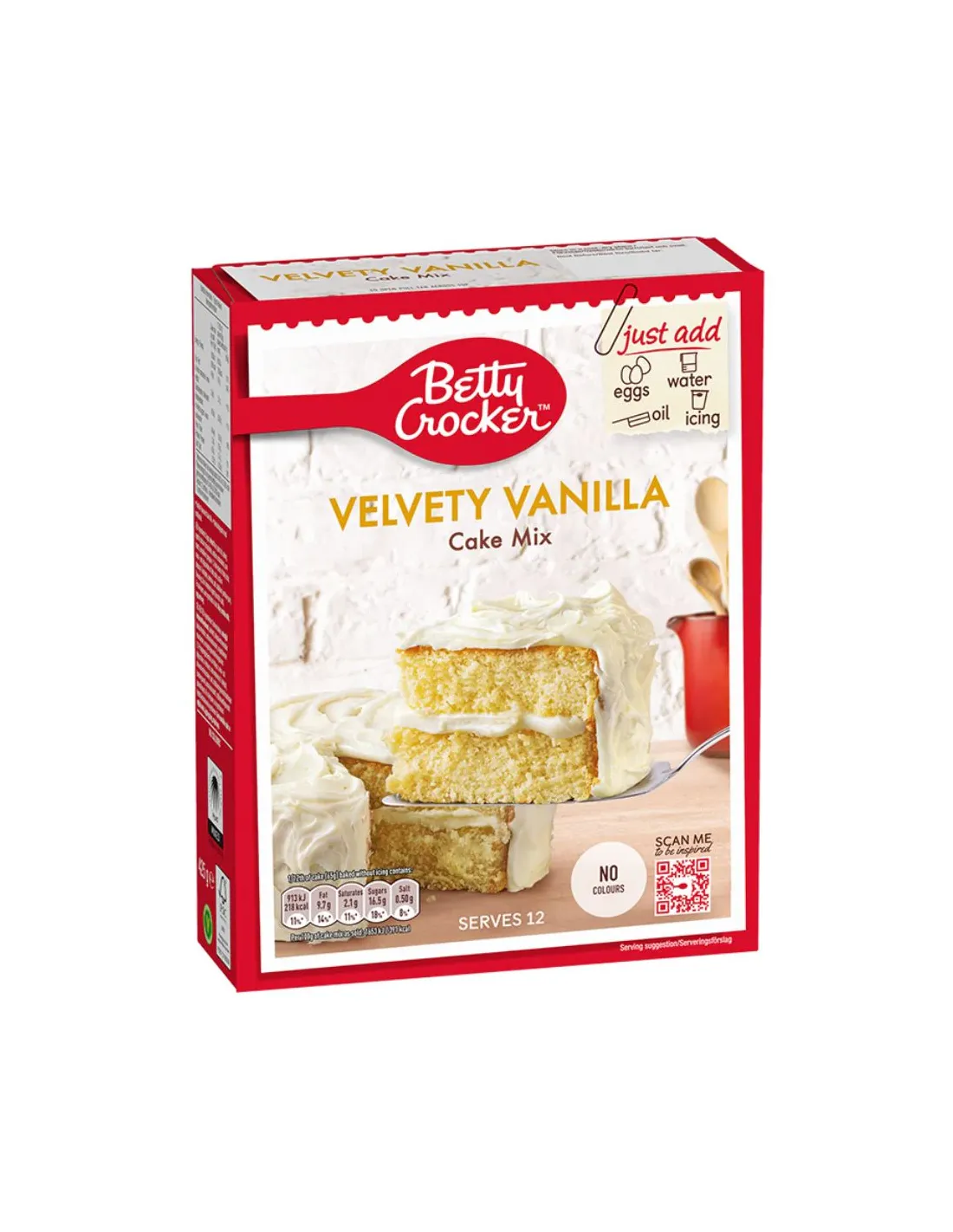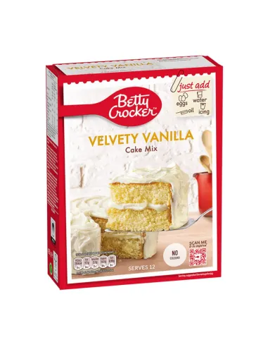 Betty Crocker Velvety Vanilla Cake Mix es muy fácil de hacer. ¡Fácil de usar, te permite hacer hermosos pasteles para una fiesta exitosa! Todas las indicaciones están presentes en la parte posterior de la caja, solo necesita agregar agua o leche, aceite vegetal y huevos. Puedes completar tu pastel con betty crocker glaseado o mermelada .