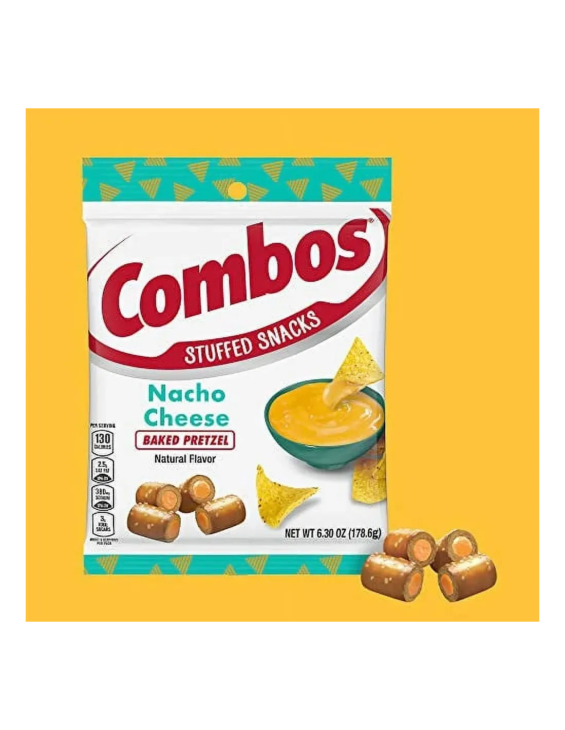 Los combos de pretzel horneado con queso para nachos transportan tu paladar directamente a un estadio estadounidense donde los nachos y el queso derretido son los reyes. Estos pequeños tubos de pretzel horneados tienen un centro de queso para nachos suave y sabroso , hecho con ese icónico queso naranja que se encuentra en los puestos de comida estadounidenses, conocido por sus notas picantes y reconfortantes.