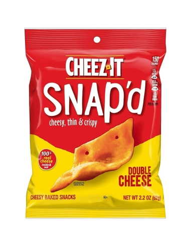 Las Cheez-It Snap'd Double Cheese son unas galletas americanas ultrafinas y extracrujientes con doble dosis de queso . Hechas con 100 % de auténtico cheddar ( cheddar blanco en la masa y cheddar espolvoreado por encima), ofrecen una explosión de queso en cada bocado. Textura deliciosamente fina con un irresistible crujido . Lácteos kosher . Práctico envase de 62 g . Hechas en EE. UU. por Kellanova .