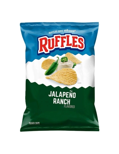 Descubre las patatas fritas Ruffles Jalapeño Ranch (184 g) : ¡la irresistible innovación americana! La combinación perfecta entre el dulce aroma de la salsa Ranch y el delicioso toque picante del jalapeño en una patata frita ondulada ultracrujiente.