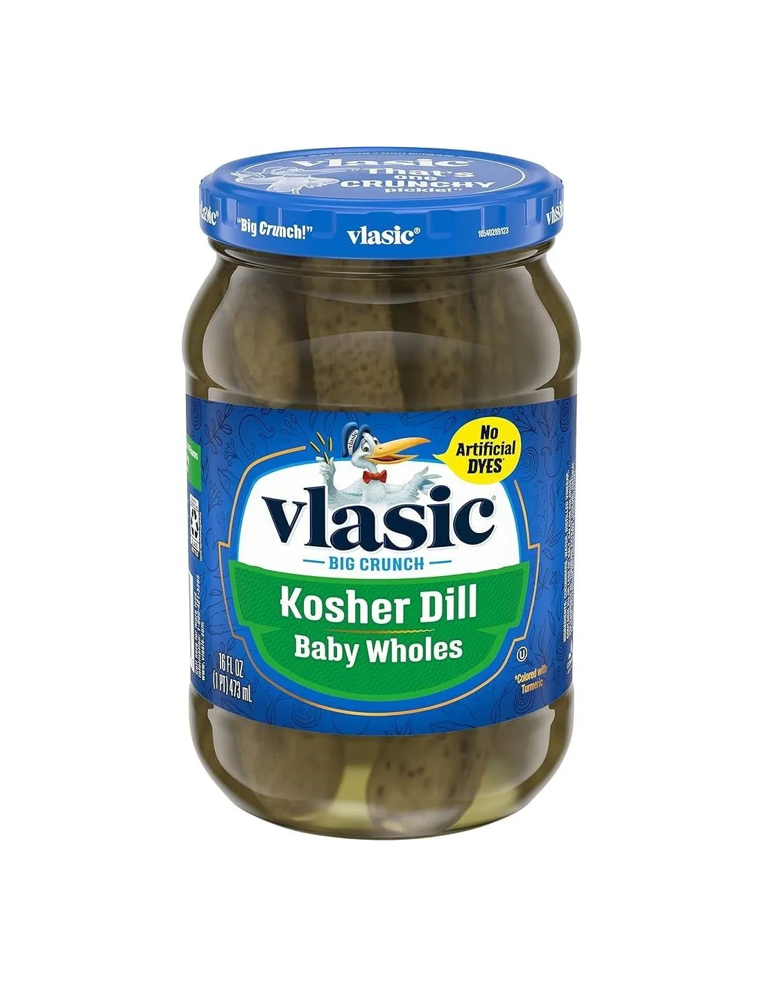 Los pepinillos encurtidos Vlasic Kosher Dill Baby son la versión más pura del pepinillo americano. Enteros, súper crujientes, ácidos y rebosantes de eneldo.