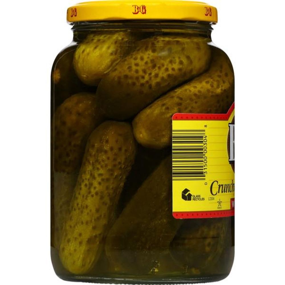 Los pepinillos enteros B&G Kosher Dill son pepinillos americanos enteros , encurtidos con eneldo según una receta kosher tradicional . Su forma entera, sin cortar , su textura crujiente y su clásico sabor ácido los convierten en el auténtico pepinillo americano por excelencia. En un generoso frasco de 946 ml .
