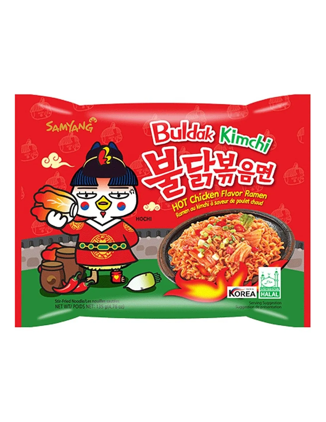 Con los fideos de pollo picantes con kimchi en un paquete de 135 g, te encantará este caldo de pollo picante con su auténtico sabor a kimchi coreano. Es la comida perfecta para cuando tienes prisa, ya que solo tienes que abrir el paquete de fideos y especias, añadir agua caliente y remover.