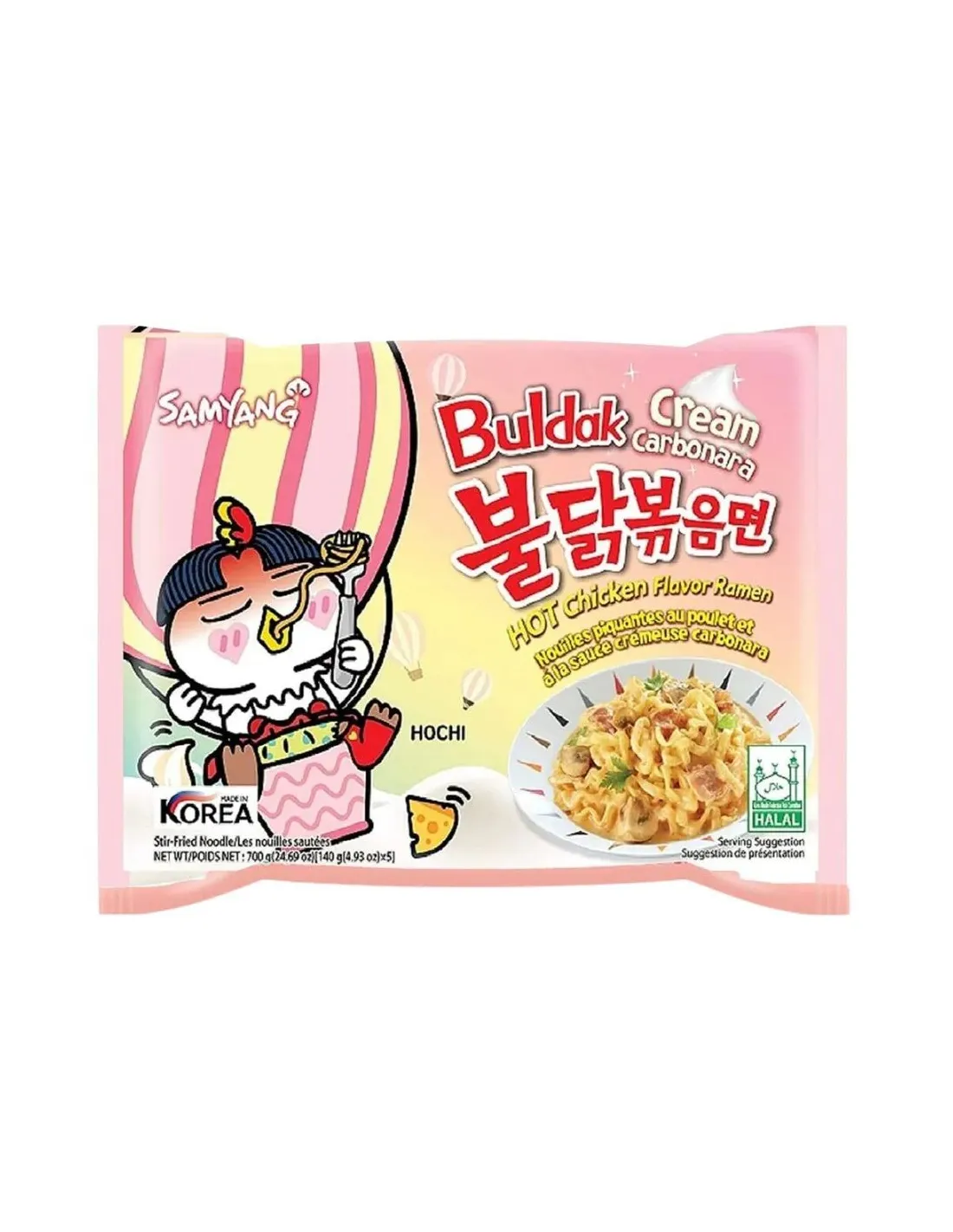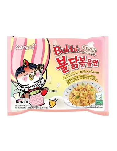 Con los fideos de pollo picantes a la carbonara en un paquete de 130 g, te encantará este caldo de pollo picante con su salsa carbonara . Es la comida perfecta para cuando tienes prisa, ya que solo tienes que abrir el paquete de fideos y especias, añadir agua caliente y remover.