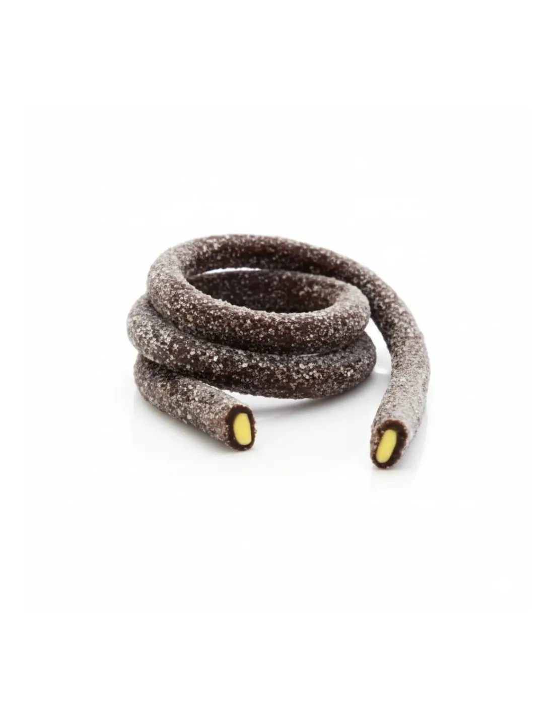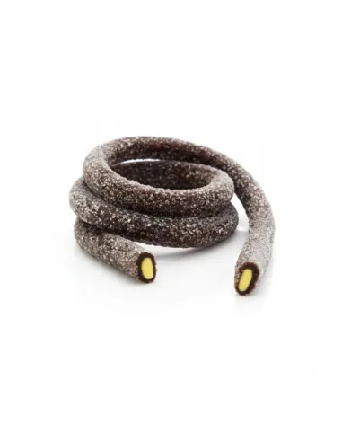 Esta tira extralarga de regaliz de 60 cm está cubierta de azúcar ácida y desprende un delicioso sabor a cola efervescente.