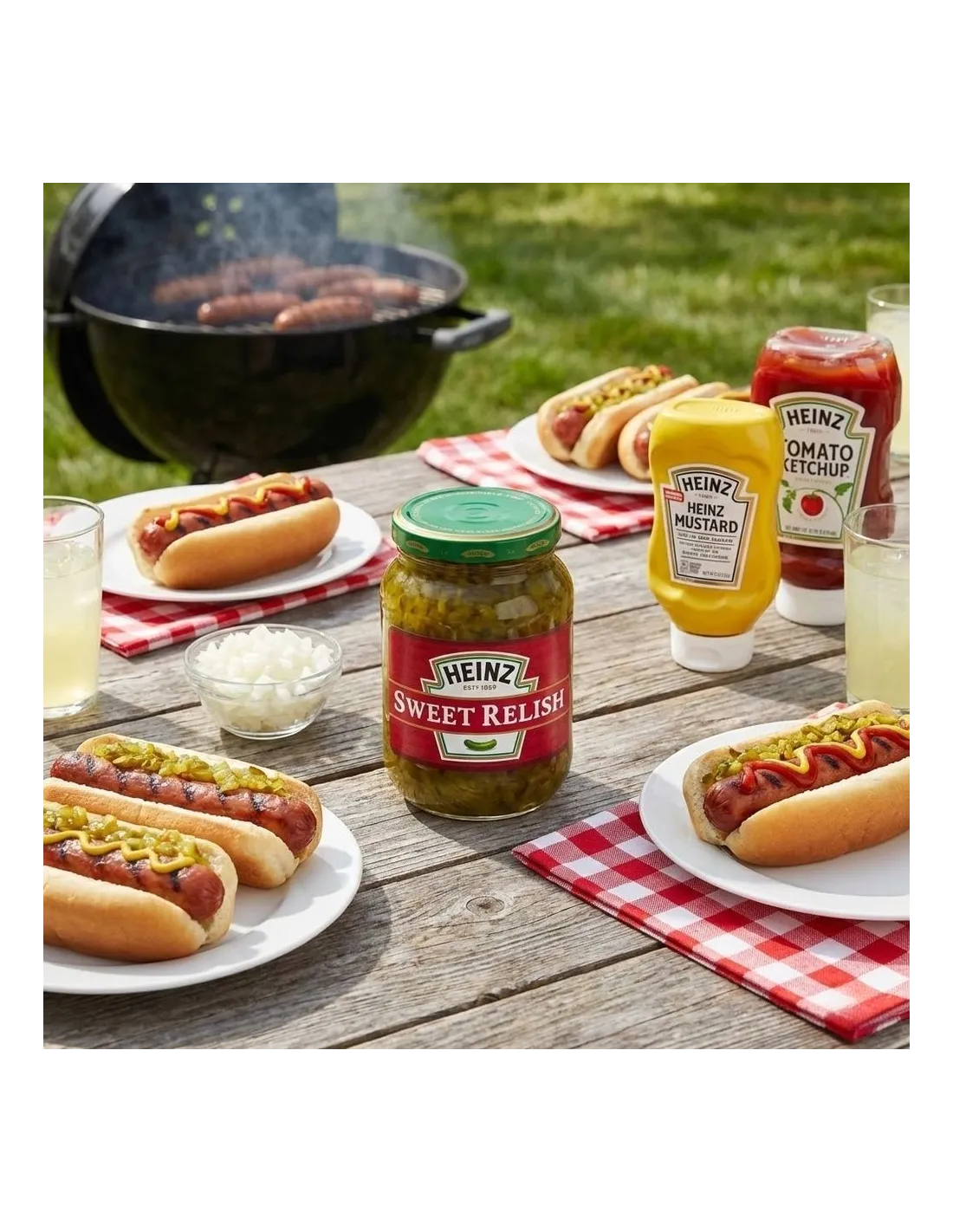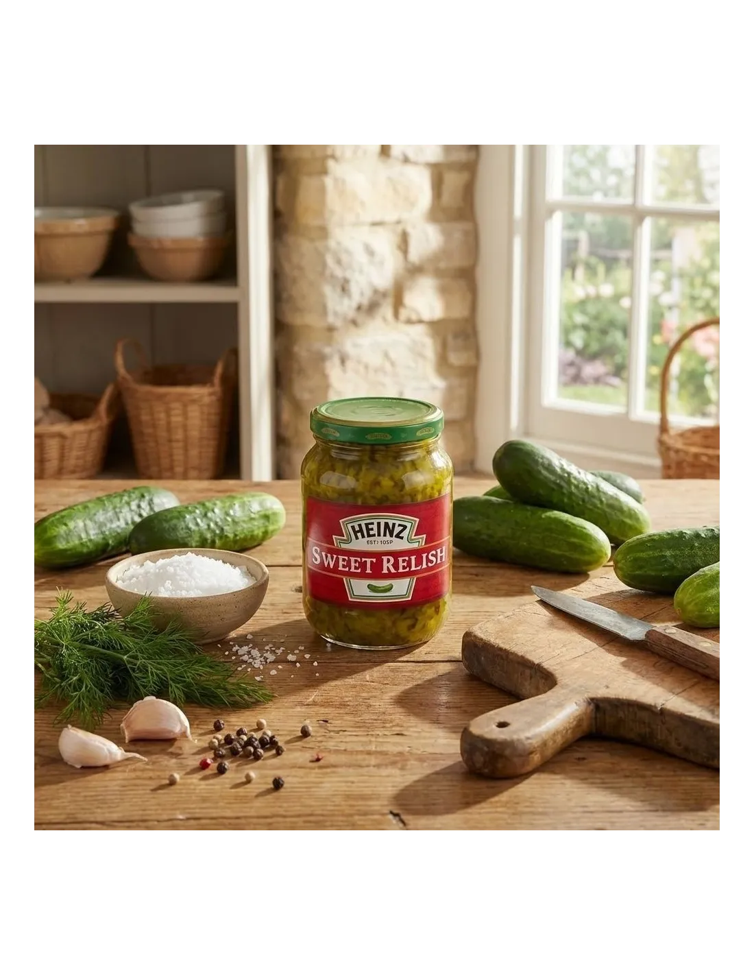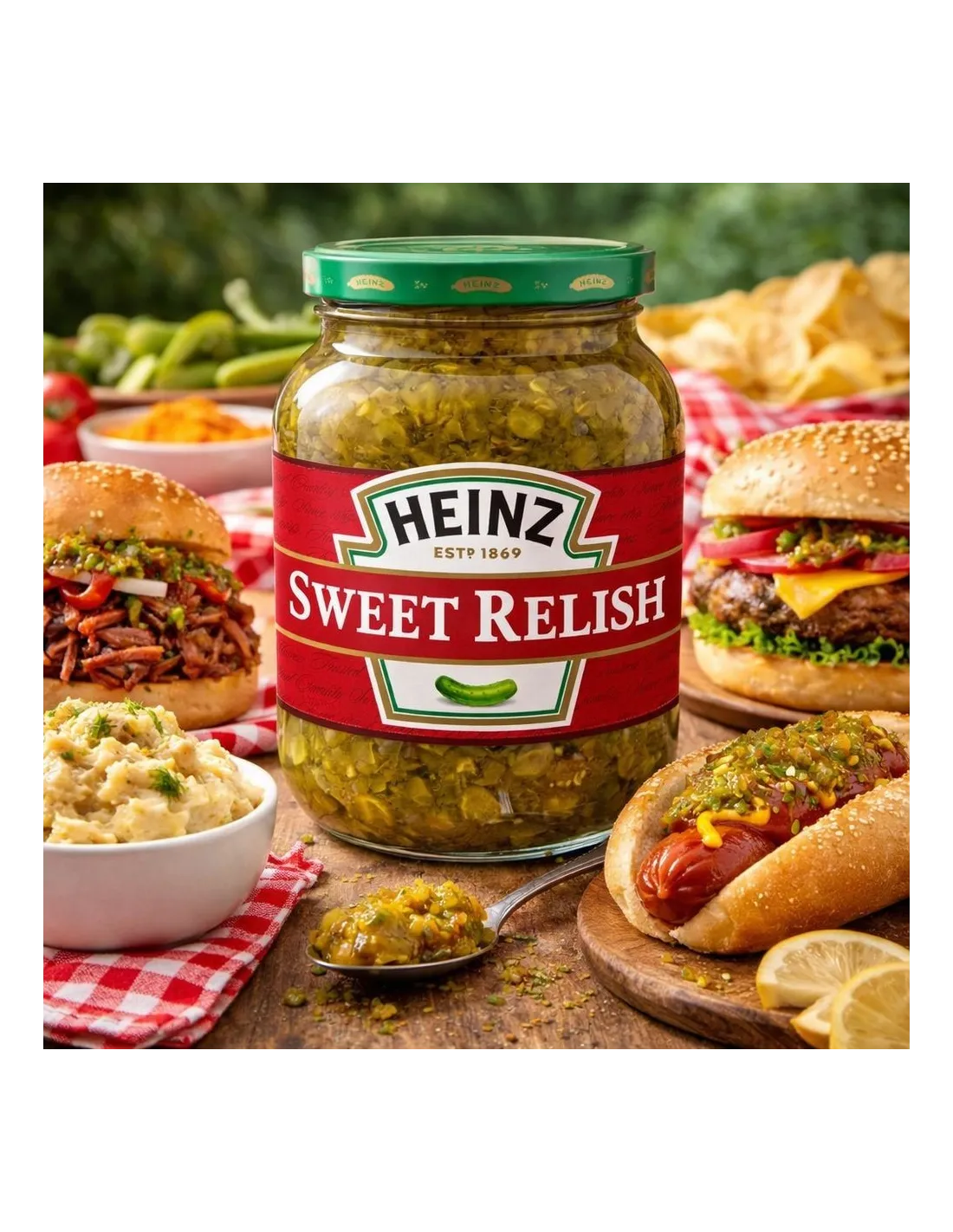 Complementa tus platos favoritos con la salsa HEINZ SWEET RELISH DOUCE . Marinada con pepinos, repollo marinado crujiente y pimientos pequeños, esta salsa de vinagre sazonada con cúrcuma es una auténtica delicia culinaria. Deliciosamente picante, esta salsa es una mezcla de dulce y picante para una explosión de sabor en la boca.