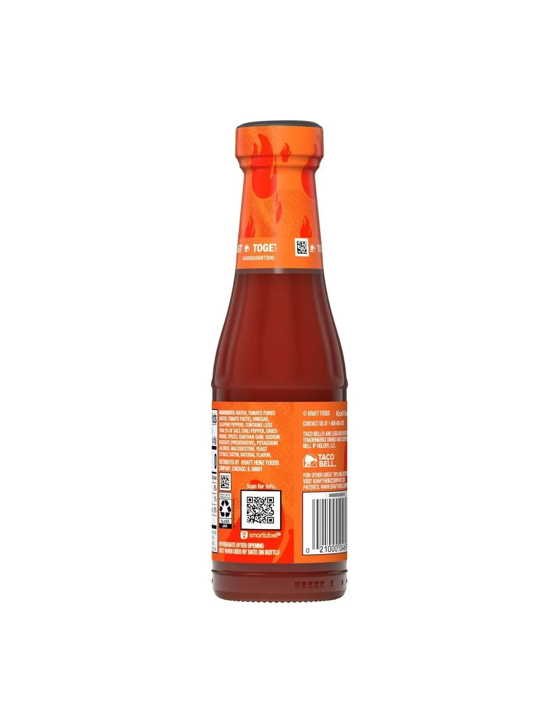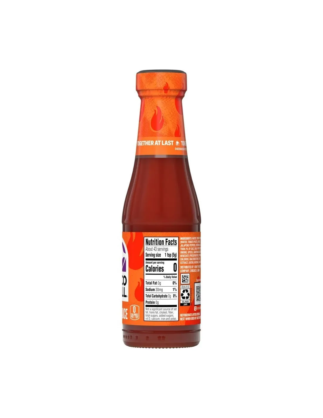 La salsa picante Taco Bell es la versión picante de la famosa salsa Tex-Mex de comida rápida estadounidense. Elaborada con jalapeños , puré de tomate, chiles y cebolla deshidratada , ofrece un picor abrasador estimado entre 2500 y 3000 unidades Scoville, comparable al Tabasco original. 0 calorías por porción.