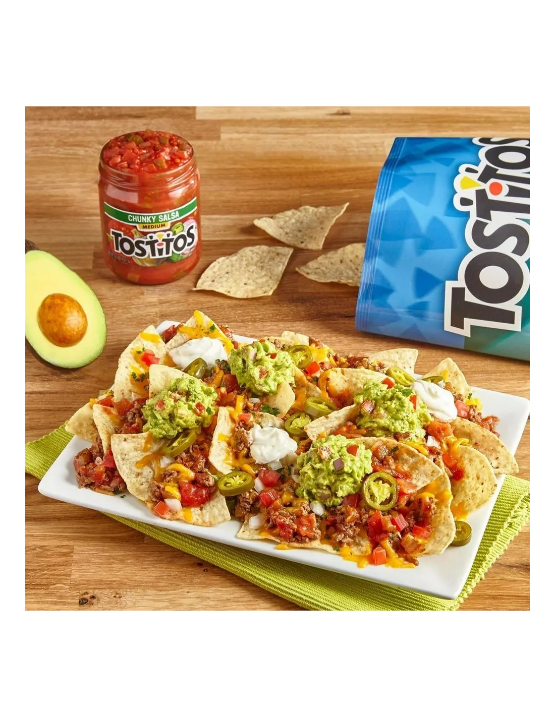 La marca Tostitos fue creada en 1978 por Jack Liczkowski, director de desarrollo de productos de Frito-Lay. El objetivo era ofrecer una alternativa más auténtica a los Doritos: totopos redondos de maíz blanco con un distintivo sabor mexicano, logrado mediante un proceso tradicional de nixtamalización. El nombre proviene del español "tostadito". El éxito fue inmediato: para 1985, Tostitos alcanzaba los 200 millones de dólares en ventas anuales. El icónico logotipo esconde un mensaje sutil: las dos "T" representan a dos personas mojando un totopo (el triángulo amarillo) en un tazón de salsa (el punto rojo de la "i"). La gama de salsas también incluye versiones medianas y picantes para quienes buscan una salsa más intensa. Como dice el eslogan de Tostitos: "¡Llega a lo bueno!"
