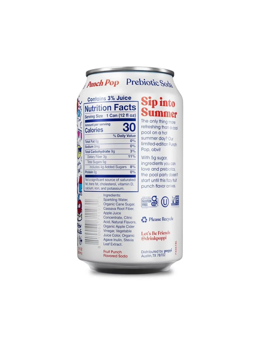Elaborado en EE. UU., Poppi Punch Pop no contiene colorantes artificiales, edulcorantes químicos ni conservantes .