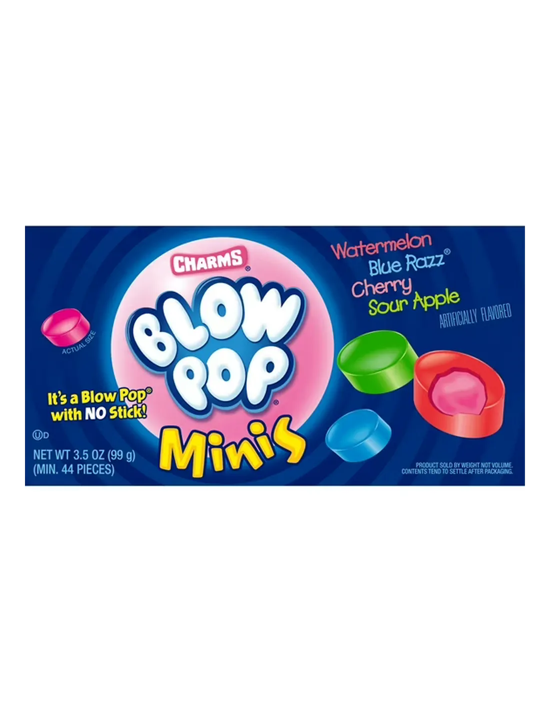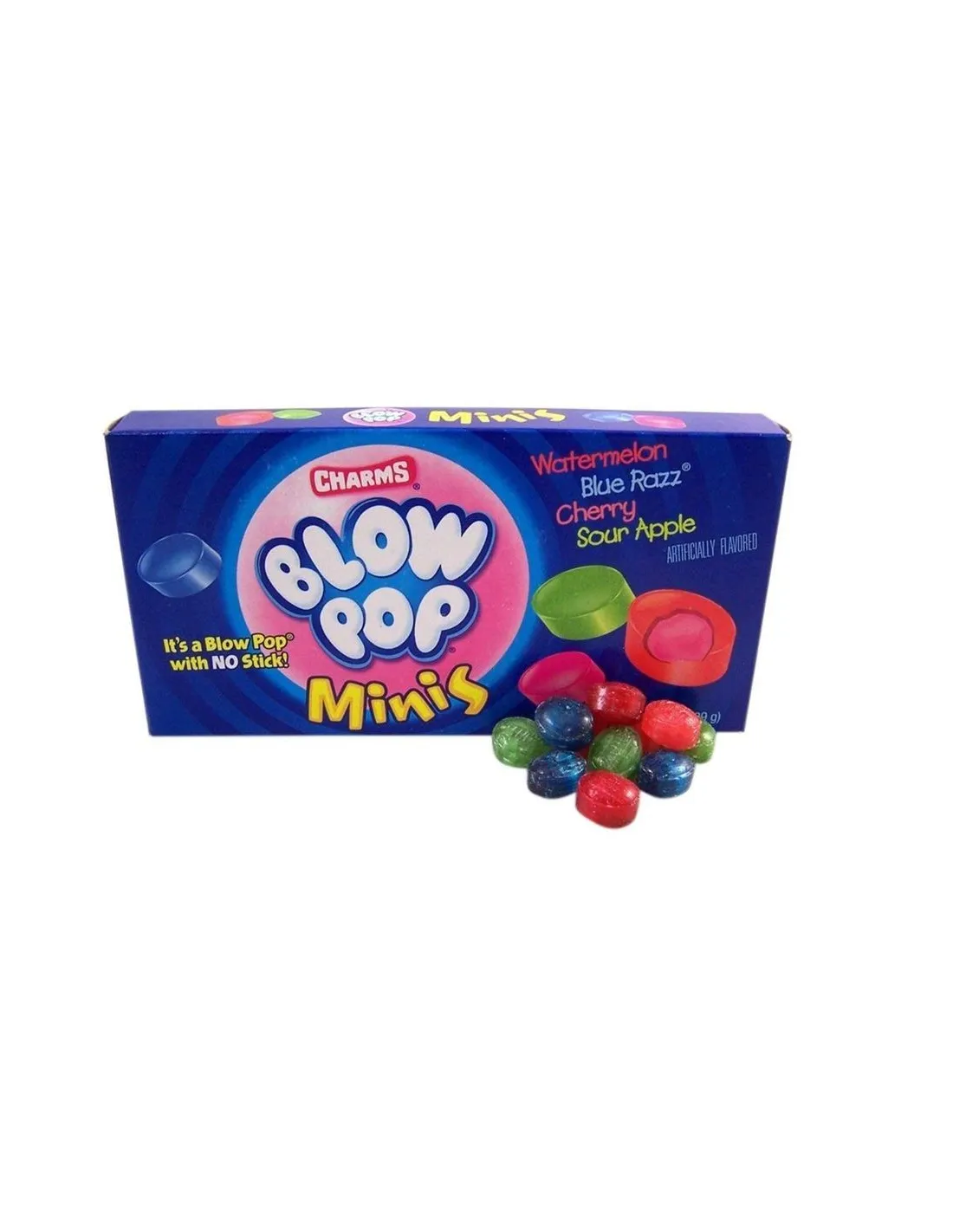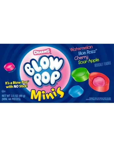 You probably know the Charms brand , specialized in American cotton candy. Charms also offers different candies and lollipops. One of its flagship products are American Blow Pop candies , small bites with a fruity taste. Find the Blow Pop in a mini version in a 99g box with 4 different flavors: