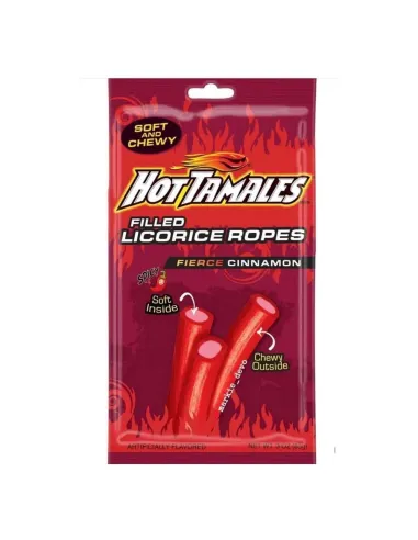 Delicious soft candy ropes with an intense cinnamon spice flavor, and a sweet and tangy gooey center. A spicy treat for thrill-seekers with Hot Tamales Filled Ropes Fierce Cinnamon !