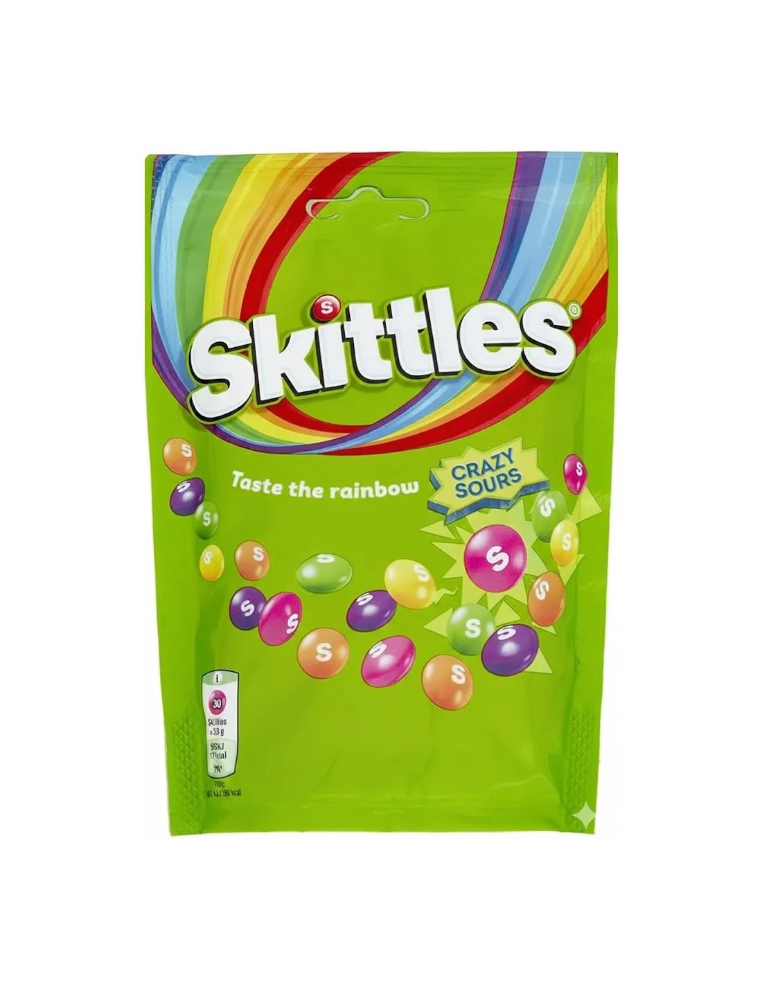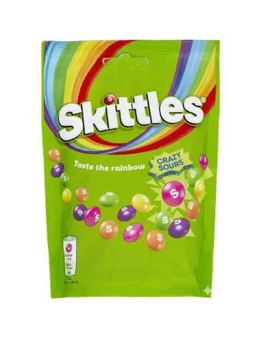 You'll find that famous crunchy sugar shell with fruity flavors. Crazy Sours are slightly more sour than the original Skittles. Each pack (136g) offers several flavors :