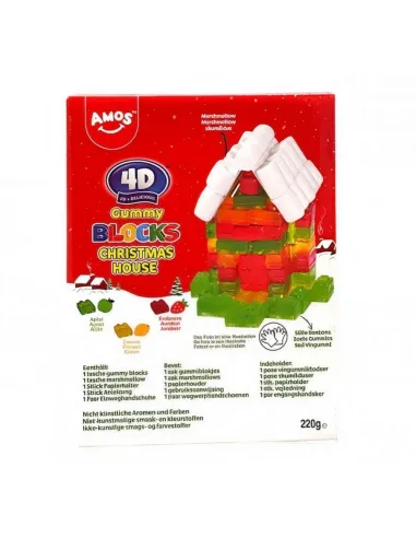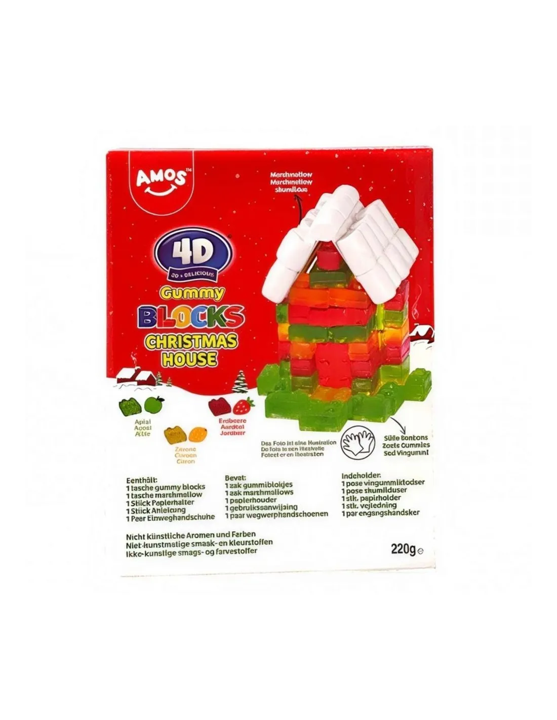 The Amos 4D Gummy Blocks House Christmas kit is a set of gummy candy blocks to build your own edible Christmas house . The colorful blocks come in apple , strawberry , and vanilla flavors, along with mini candy canes for decoration. A fun and delicious activity for the holidays.