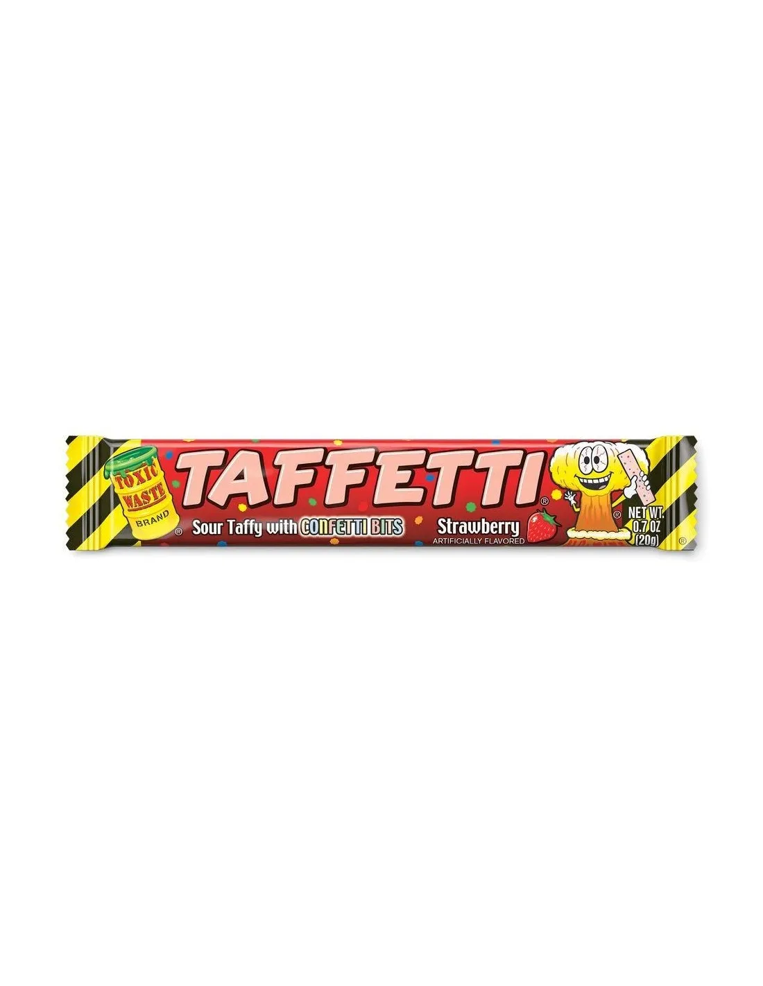 Toxic Waste Taffetti Strawberry is the latest innovation from the cult American brand of sour candies. This soft, stretchy taffy combines an intense strawberry flavor with Toxic Waste's signature extreme sourness, all topped with colorful, crunchy confetti . A unique texture that alternates between chewy and crunchy with every bite. Conveniently individually wrapped.