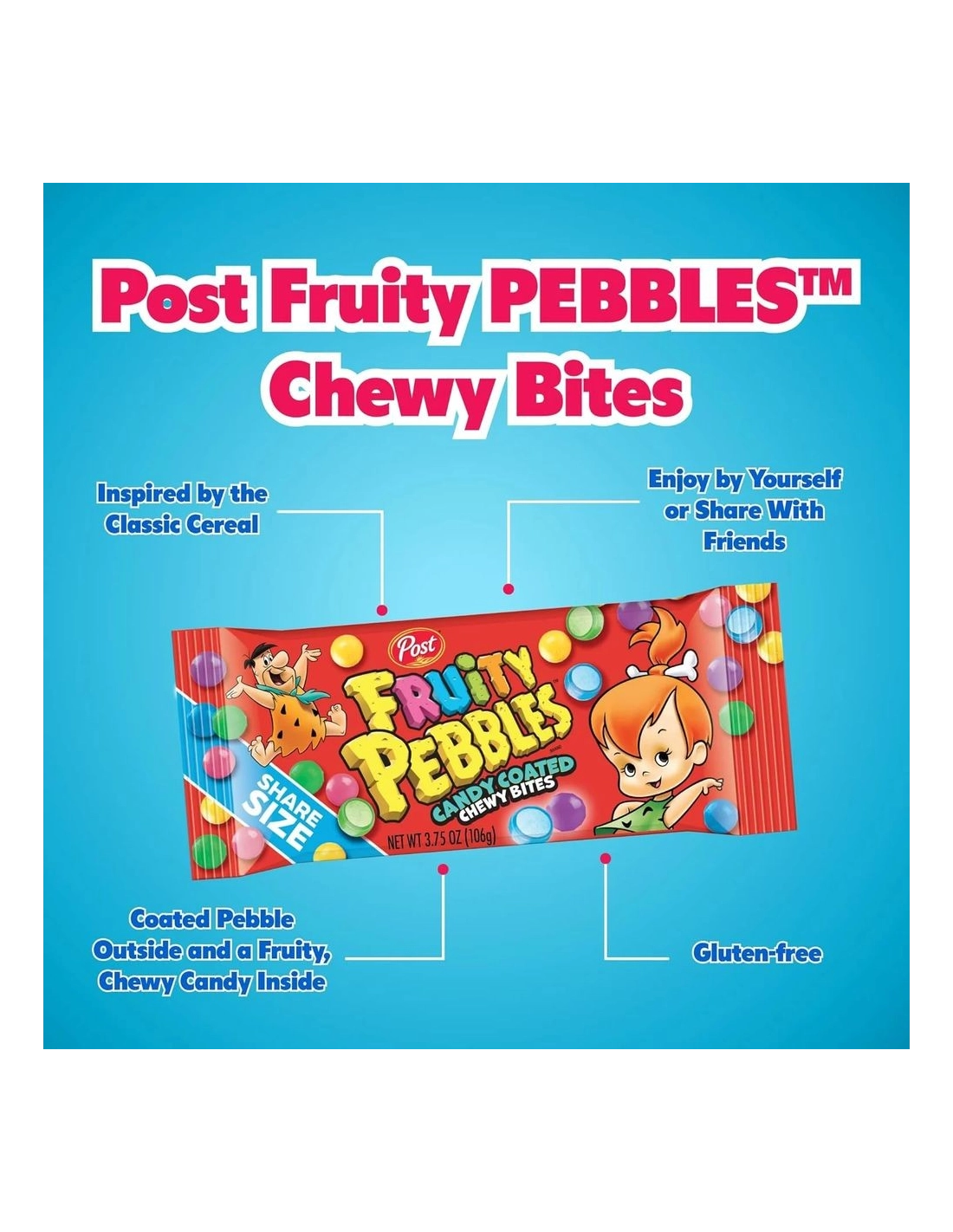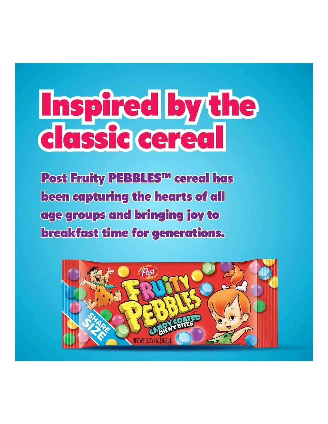 Dive into the colorful world of Bedrock with Fruity Pebbles Candy Coated Chewy Bites β tasty bites that transform America's most famous cereal into an irresistible candy.