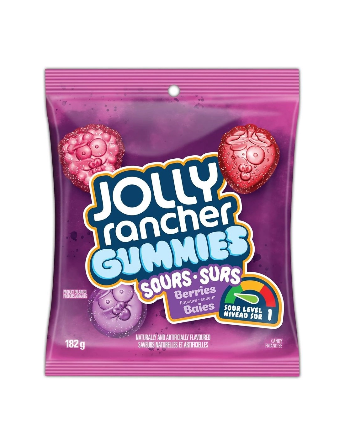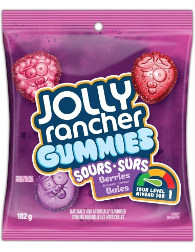 Get ready for a fruity and tangy explosion with Jolly Rancher Gummies Sour Berries (182g) ! Directly imported from Canada , this generous bag reinvents the North American candy legend in the form of soft gummies coated in tangy sugar . Let yourself be tempted by these irresistible little bites with intense berry flavors (blue raspberry, wild cherry, blackberry, strawberry...). The perfect tangy and fruity snack to make your taste buds tingle!