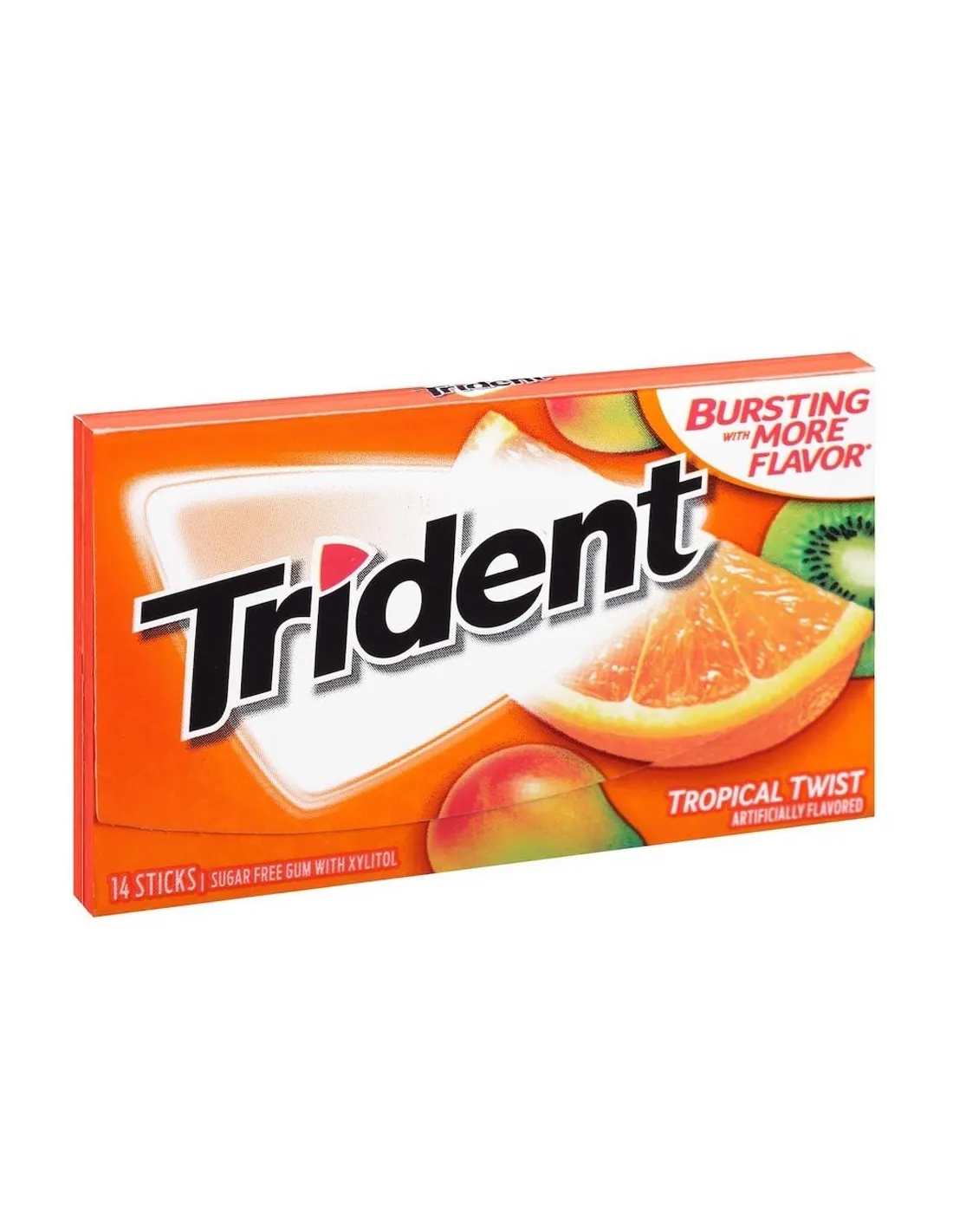 Found in all gas stations in the USA , Trident brand chewing gum is very popular with Americans. Each box contains 14 tropical fruit flavored sticks. All Trident chewing gums are made with xylitol , a natural sugar alcohol. Every time you put it in your mouth, the tropical fruit flavor explodes.