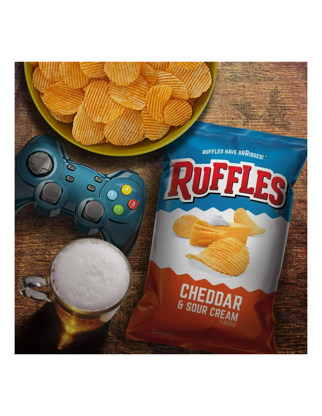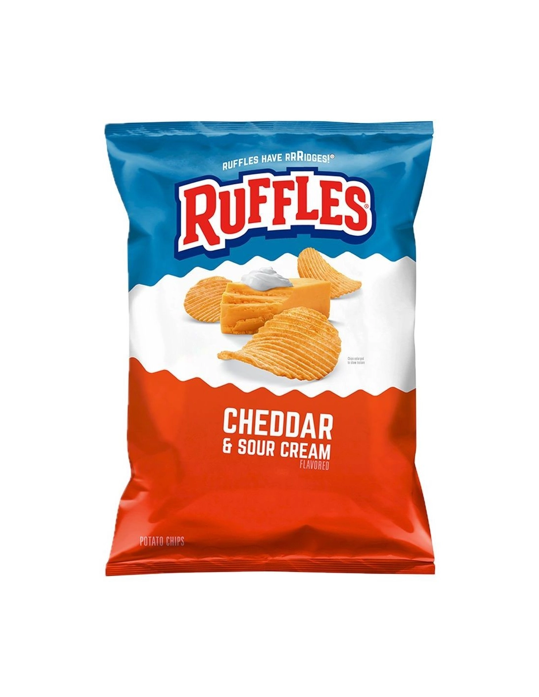 Discover Ruffles Cheddar & Sour Cream Chips (184g) : the absolute best-seller in the USA! Delicious American wavy chips with an intense taste of cheddar cheese and tangy sour cream.