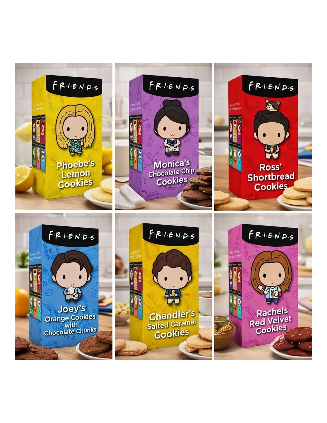Part of the official Friends ™ collection, these cookies feature collector's packaging inspired by Ross Geller's character, with colors and nods to the cult sitcom.