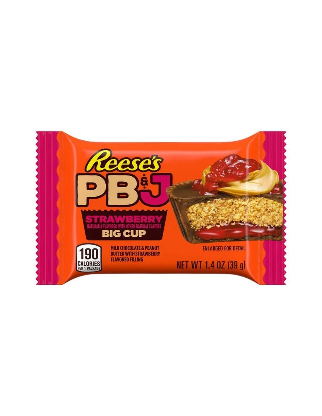Reese's Big Cup PB&J Strawberry reinvents the American classic: milk chocolate , creamy peanut butter , and a layer of strawberry-flavored topping . A tribute to the legendary PB&J (Peanut Butter & Jelly) sandwich in a generous Big Cup format. Gluten-free and kosher .