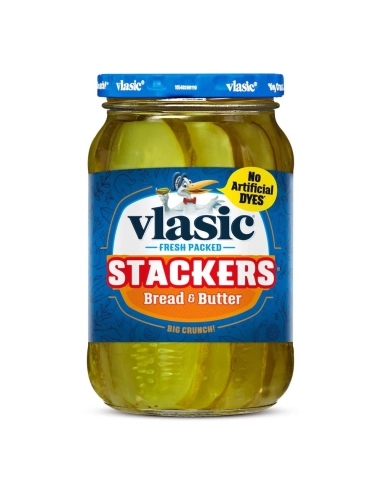 Discover Vlasic Stackers Bread & Butter (473ml) : authentic American pickles sliced lengthwise! Vlasic's iconic sweet and sour flavor in an innovative flat format, perfect for stacking in your sandwiches and burgers.