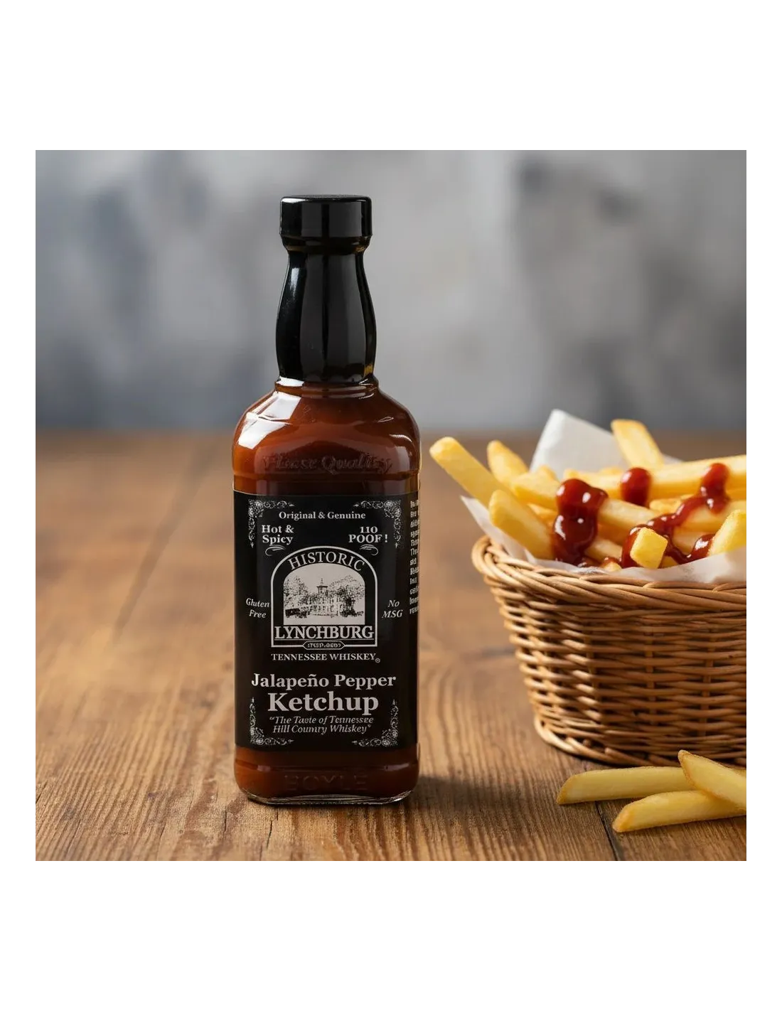 Historic Lynchburg Jalapeño Pepper Ketchup with Jack Daniel's is a spicy ketchup blending tomatoes, jalapeños, and Jack Daniel's whiskey. A more intense condiment than classic ketchup, it's designed to complement burgers, grilled meats, and savory snacks.