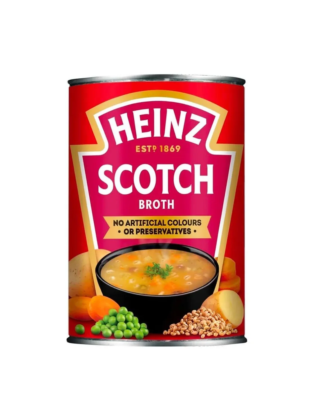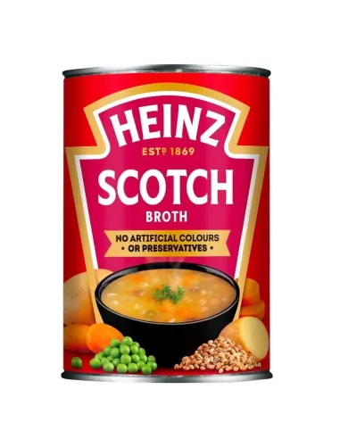 About Heinz and Scotch Broth : Heinz has been warming British hearts with its soups since 1910. Scotch Broth is one of the most iconic recipes in the Classic range, continuing a Scottish culinary tradition that dates back to the Middle Ages. Originally an economical peasant dish using less desirable cuts of mutton and locally grown barley, Scotch Broth has become a comforting classic of British cuisine. Heinz guarantees a recipe with no artificial colors or preservatives , using only trusted ingredients to recreate that homemade taste.