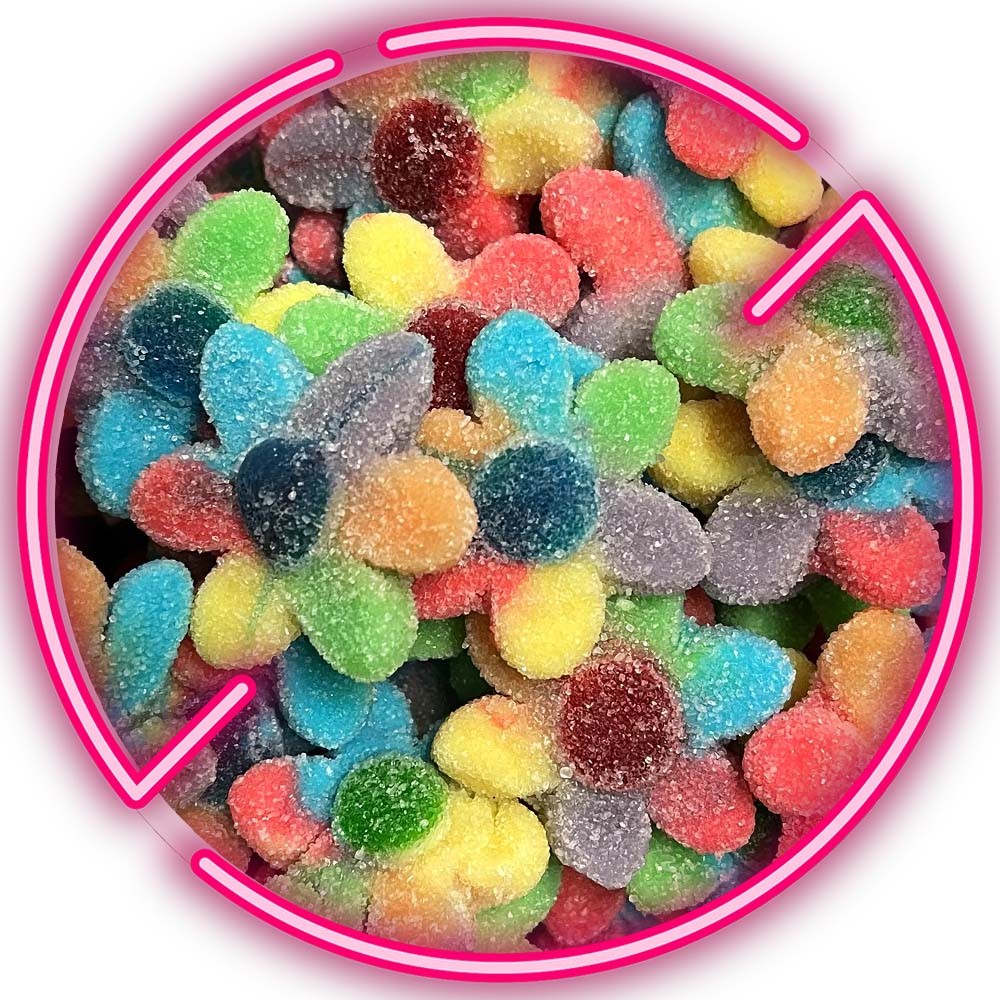 Discover the 100g bag of Sour Rainbow Flowers candies. Small multi-colored flowers with a fruity flavor covered in a slightly acidic sugar.