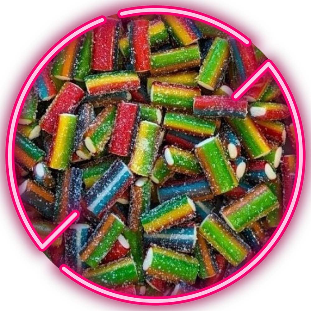 Discover the 100g bag of Mini Sour Rainbow Filled Pencils candies. Small rainbow sticks (Rainbow) with a fruity flavor covered with a slightly acidic sugar.