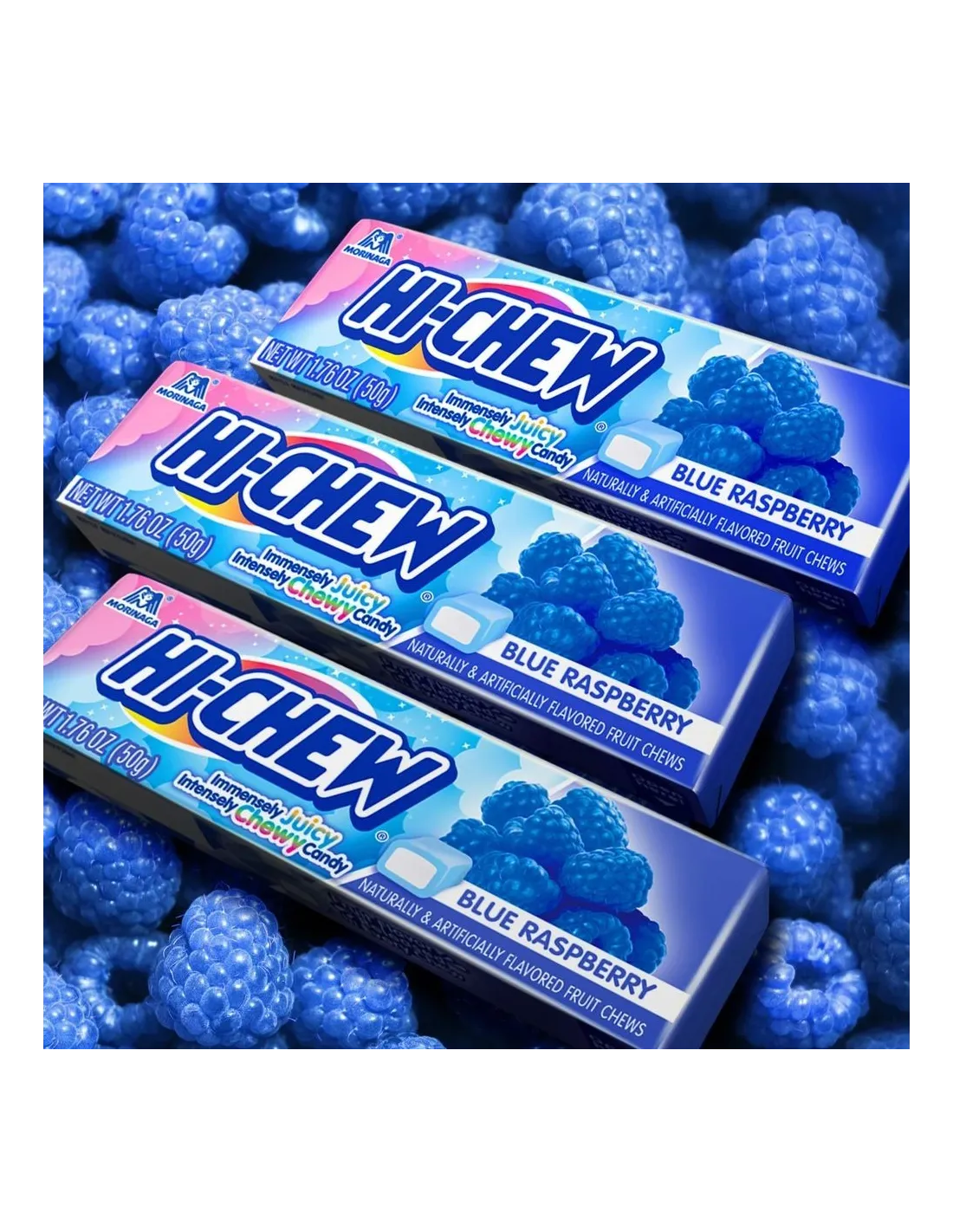 Mentre il gusto "Lampone Blu" è un punto fermo negli USA , il marchio giapponese Morinaga lo ha impreziosito con la sua consistenza distintiva. Hi-Chew Lampone Blu unisce l'esperienza giapponese (una pasta morbida e setosa) a un sapore incisivo che risveglia le papille gustative. È un connubio riuscito tra Oriente e Occidente.