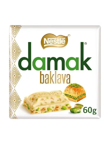 Nestlé Damak Baklava White Chocolate Pistachio unisce il morbido cioccolato bianco, i pistacchi tostati e le note caramellate che ricordano il famoso dessert turco.