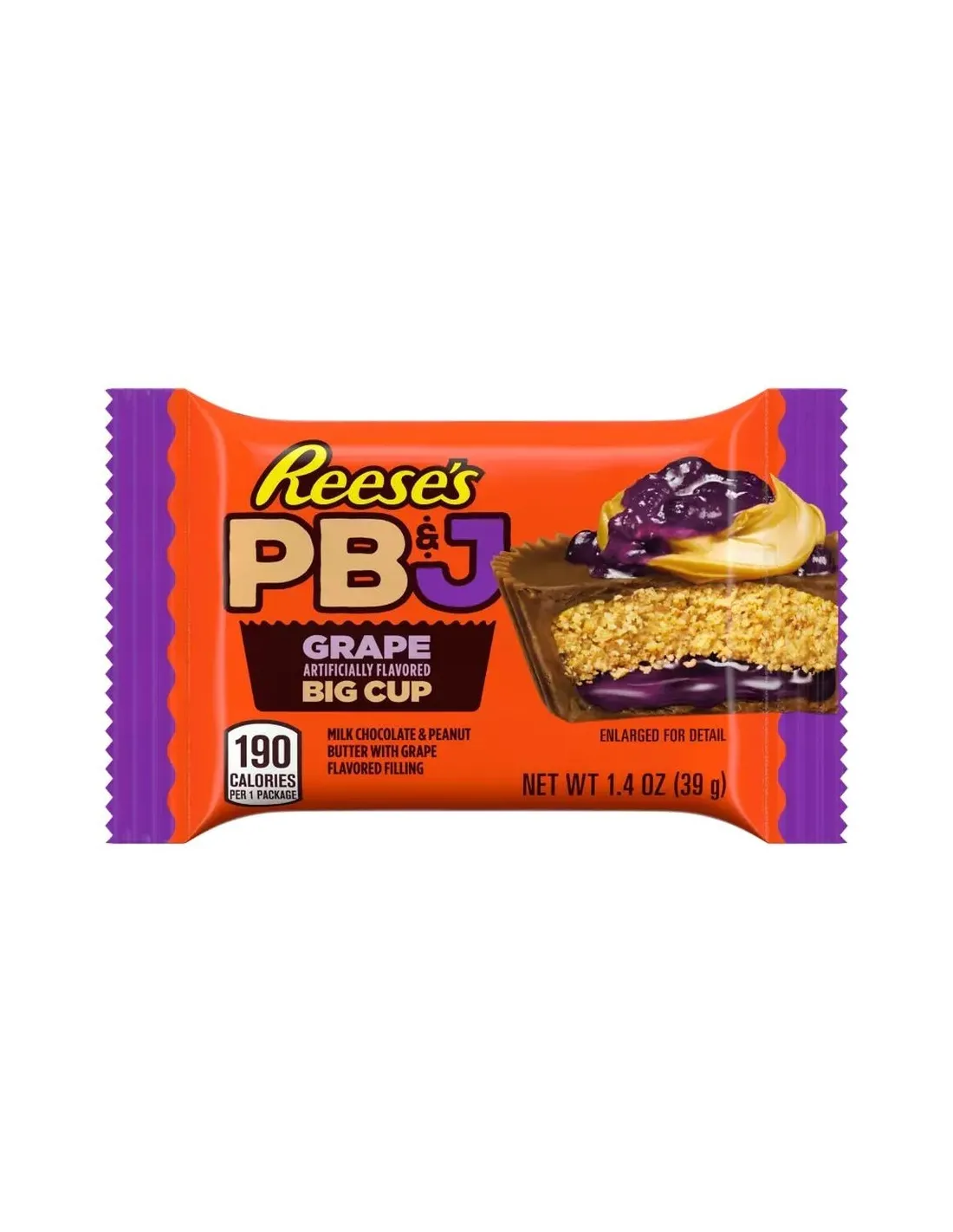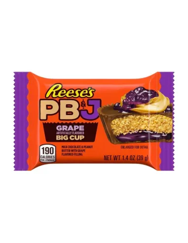 Il Reese's Big Cup PB&J Grape reinterpreta un classico americano: cioccolato al latte , cremoso burro d'arachidi e una guarnizione al gusto d'uva . Un delizioso omaggio all'iconico panino PB&J (Burro d'arachidi e gelatina) in una generosa tazza grande. Senza glutine e kosher.