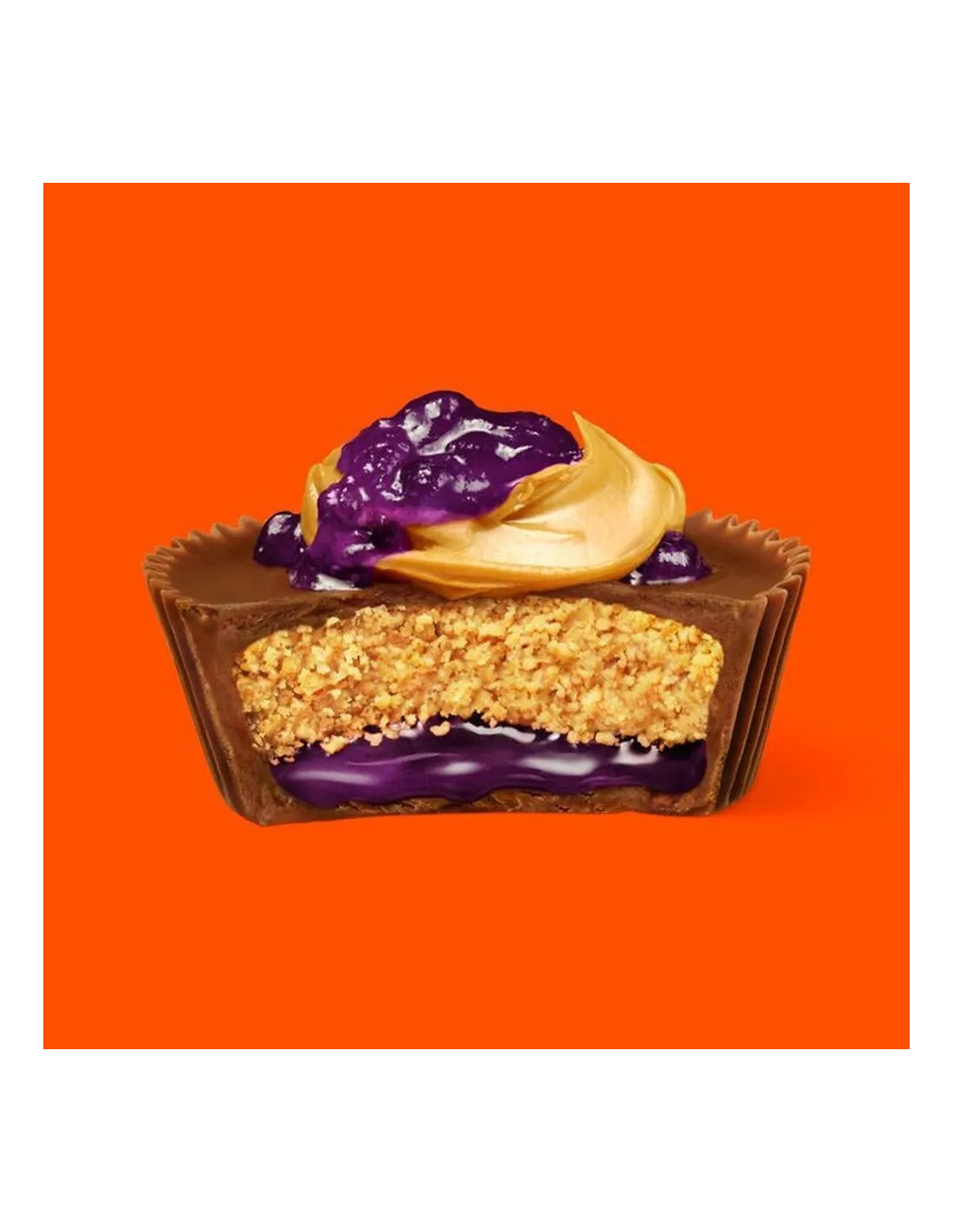 Il Reese's Big Cup PB&J Grape trasforma uno dei panini più iconici della cultura americana in un dolce al cioccolato ultra-confortevole . Questa creazione combina tre strati iconici: una morbida copertura di cioccolato al latte , un cuore cremoso di burro d'arachidi, il classico Reese's , e uno strato di ripieno al gusto d'uva che ricorda la famosa marmellata tradizionale del PB&J.