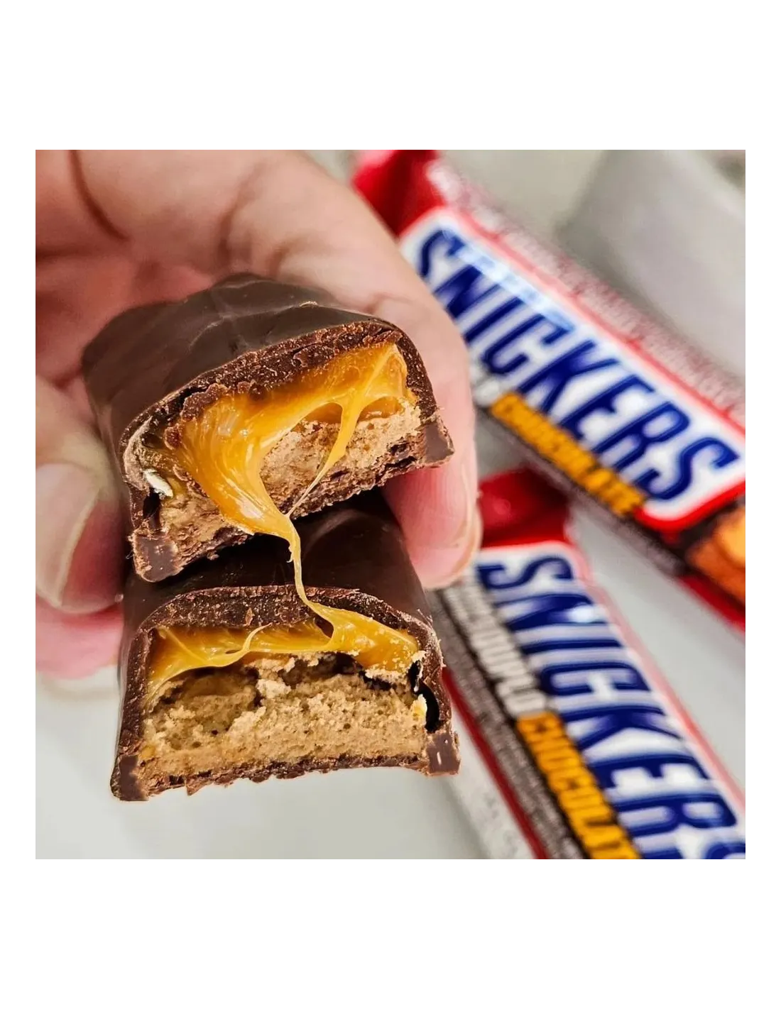 Consiglio : mettete lo Snickers Double Chocolate in frigorifero un'ora prima di consumarlo per ottenere un cioccolato più croccante e un caramello leggermente più sodo, oppure scaldatelo nel microonde per qualche secondo per ottenere un centro cremoso come un biscotto gigante.