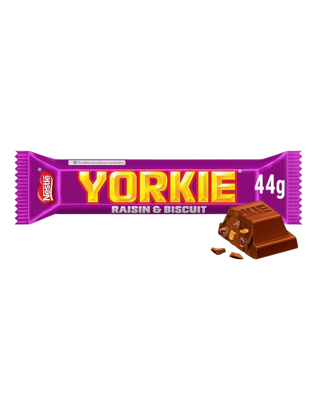 Nestlé Yorkie Uvetta e Biscotto è una deliziosa rivisitazione dell'iconica tavoletta di cioccolato britannica. Cinque grandi pezzi di morbido cioccolato al latte (minimo 25% di cacao) racchiudono succosa uvetta (13%) e croccanti pezzi di biscotto (4%). Un generoso formato da 44 g . Senza coloranti, aromi o conservanti artificiali. Cacao certificato Rainforest Alliance . Prodotto a York, Inghilterra , dal 1979 .