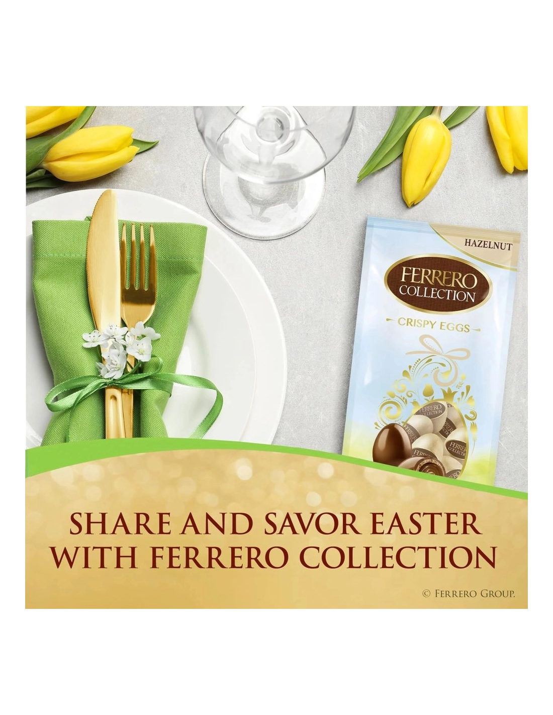 Scopri la collezione Ferrero Crispy Eggs Hazelnut : uova di cioccolato che uniscono una cialda croccante a un cuore fondente di nocciole.