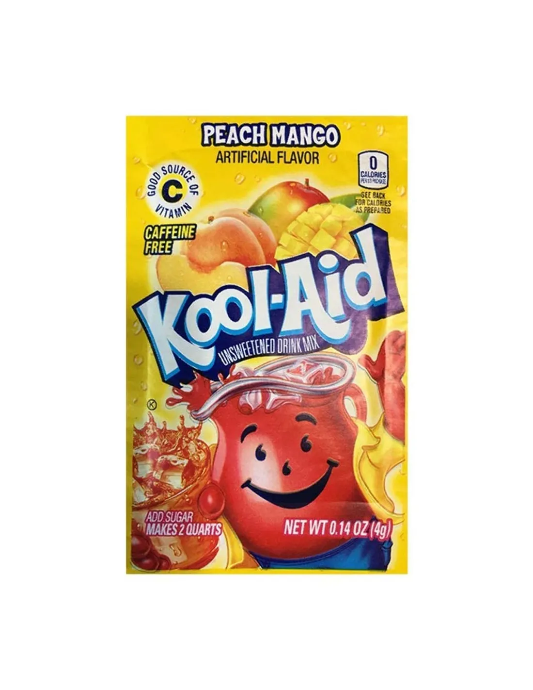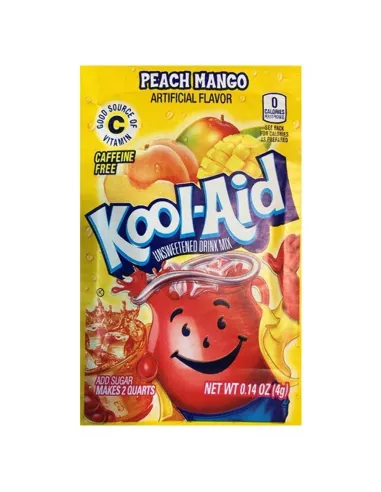 Il gusto Kool-Aid Pesca e Mango è una miscela fruttata di mango e pesca . Le bustine di polvere Kool-Aid sono fonte di vitamina C e non contengono caffeina. Tutte le polveri Kool-Aid sono senza zucchero . Puoi usarle in una varietà di bevande, da una bevanda rinfrescante a un contorno per cocktail.